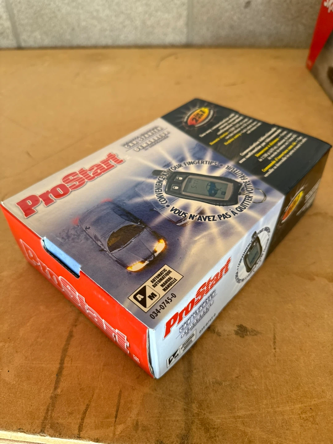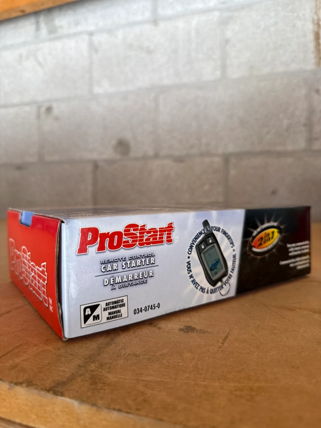 240Selling a ProStart remote control car starter in its original box! It's a 2-in-1 system for convenience at your fingertips. The box states that the remote transmitter features include a bright light backlit LCD with run-time indicator and selectable vehicle security system override modules. Please note that the box indicates that the remote control car starter must be installed by a qualified technician