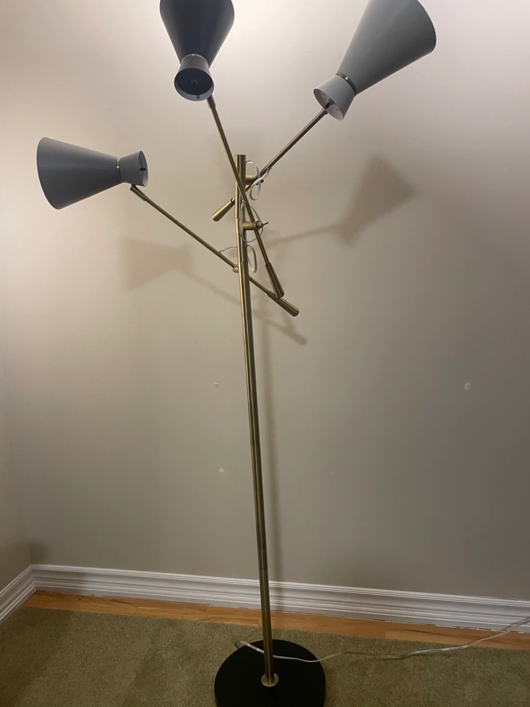Selling a stylish mid-century modern floor lamp! It features three adjustable shades in black and grey, complemented by a sleek gold-tone metal frame. This lamp would add a touch of retro elegance to any room