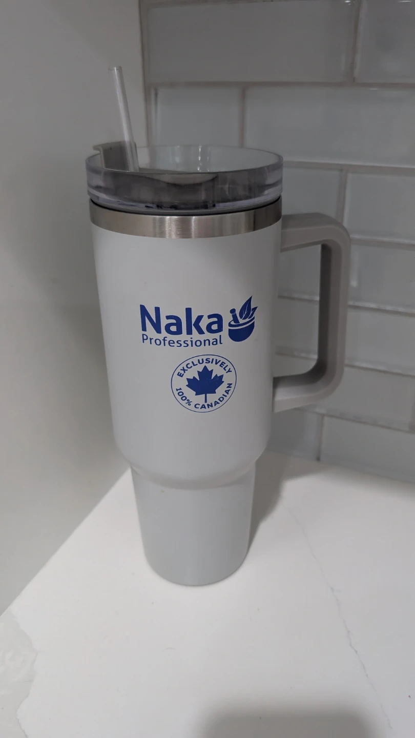 Selling a Naka Professional tumbler. It's white with a handle and includes a straw. The design features the Canadian maple leaf, showing it's 100% Canadian 40oz