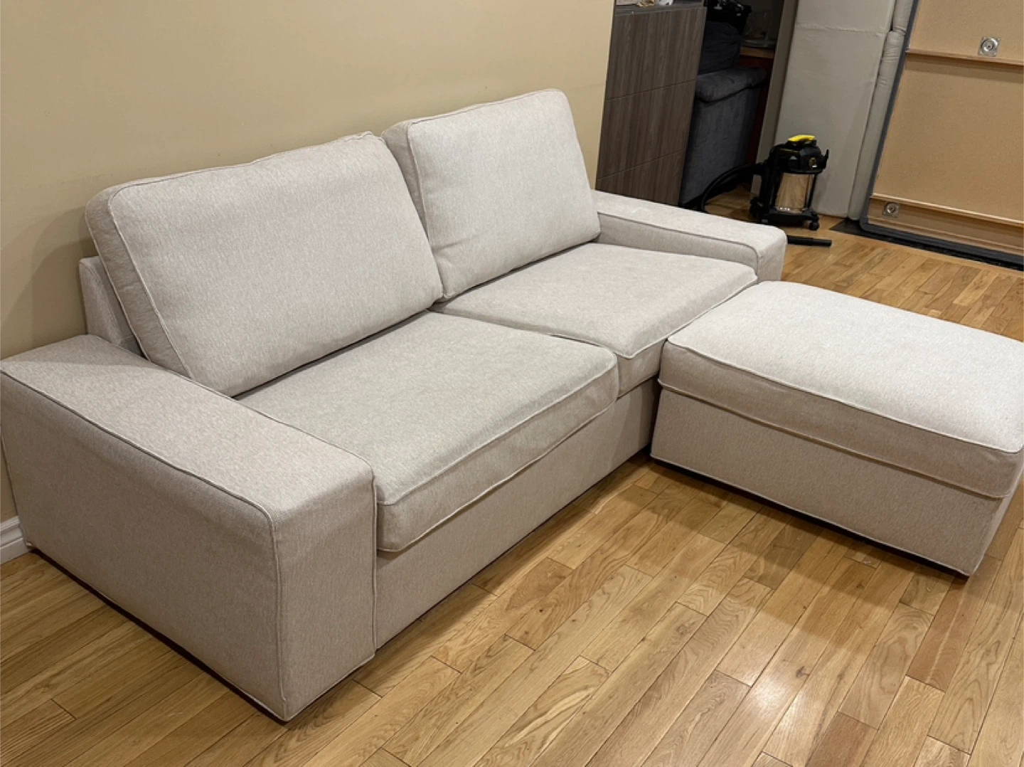 Selling our IKEA Kivik 3 Seater with matching ottoman in a neutral beige color. This set was over $1,100 new, and itโs known for its deep, comfy seats and modern design that fits easily into any space. The covers are removable and washable for easy care.