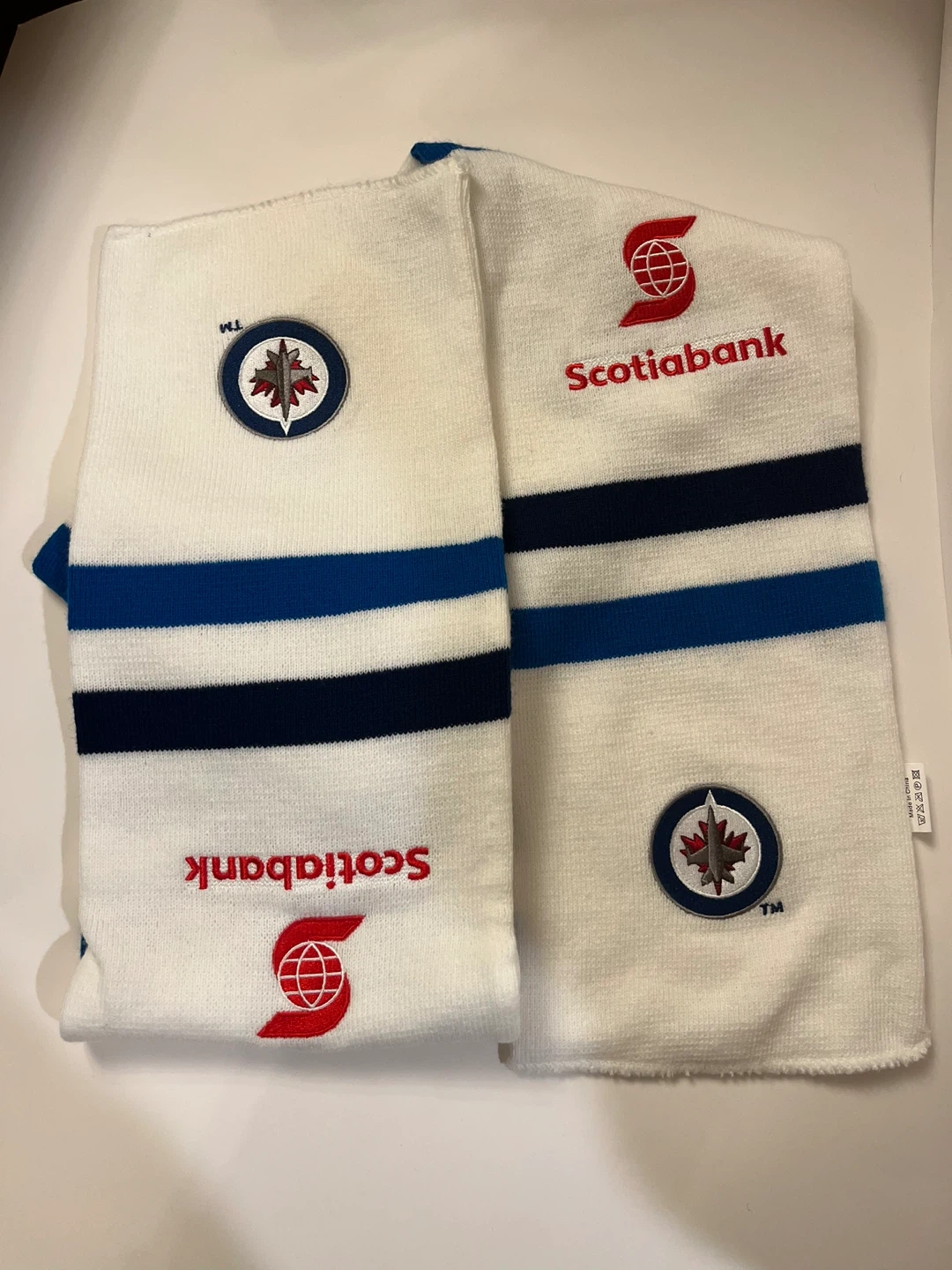 Cozy Winnipeg Jets scarf featuring the Scotiabank logo! Perfect for showing your team spirit at the next game or just staying warm on a chilly day