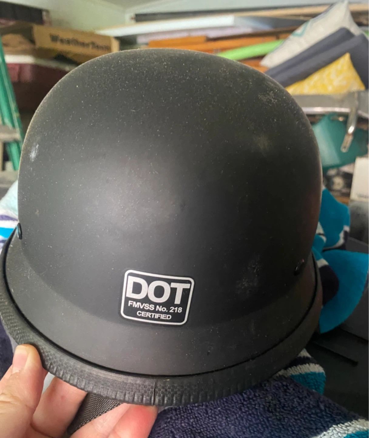 Selling a black motorcycle helmet with DOT certification. It has a matte finish and a low profile design. It is in very good condition, size medium.