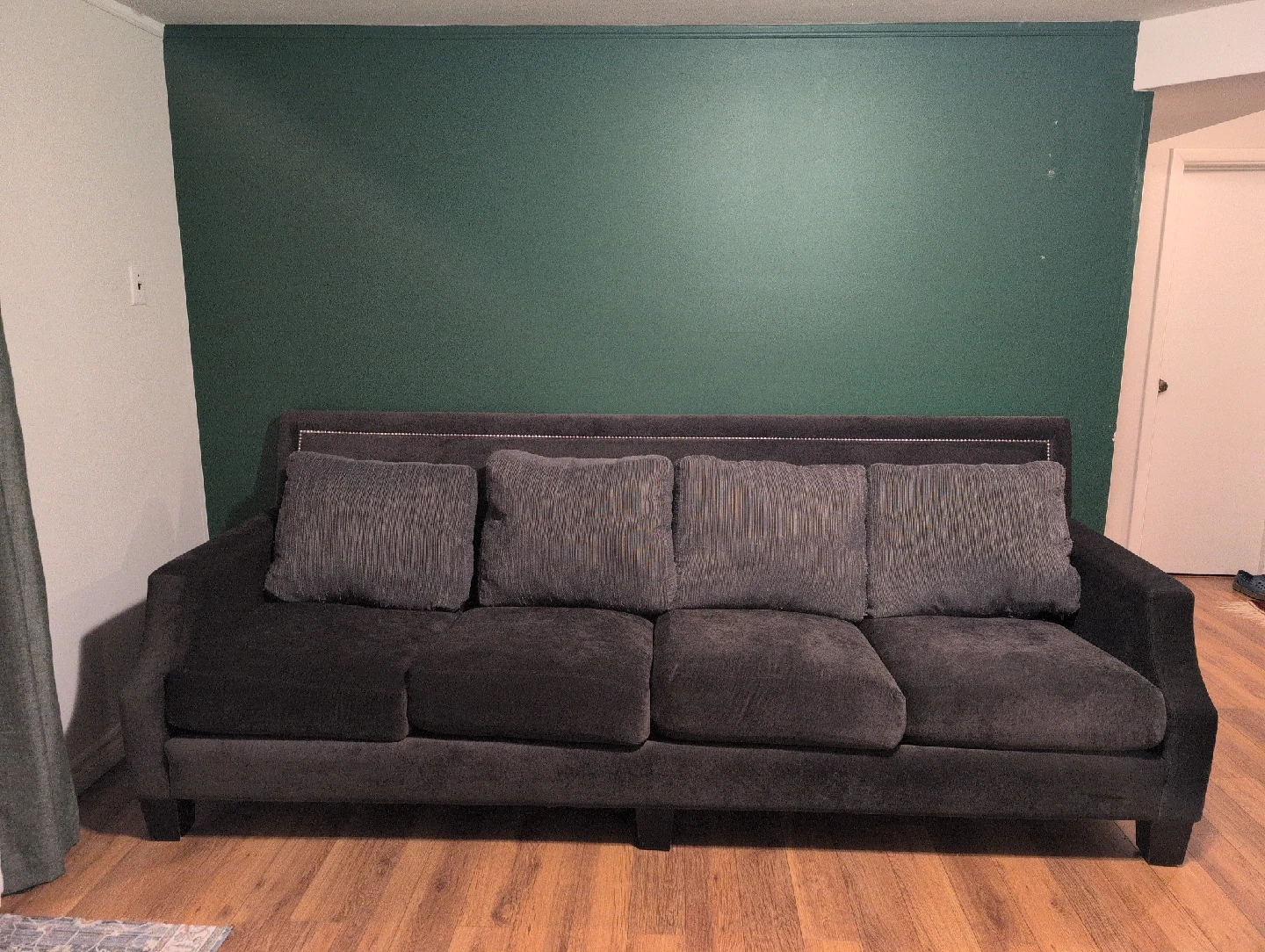 Selling a comfy dark grey sofa. It features stylish nailhead trim along the top. The sofa comes with four matching pillows. It's in great shape and ready for a new home! ($3,000) retail price.