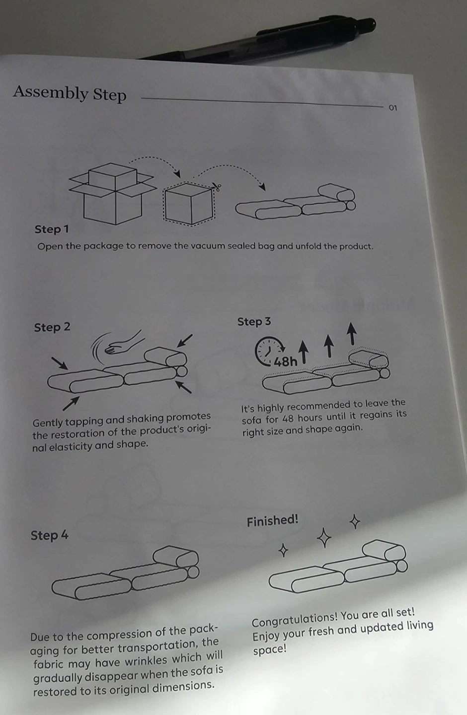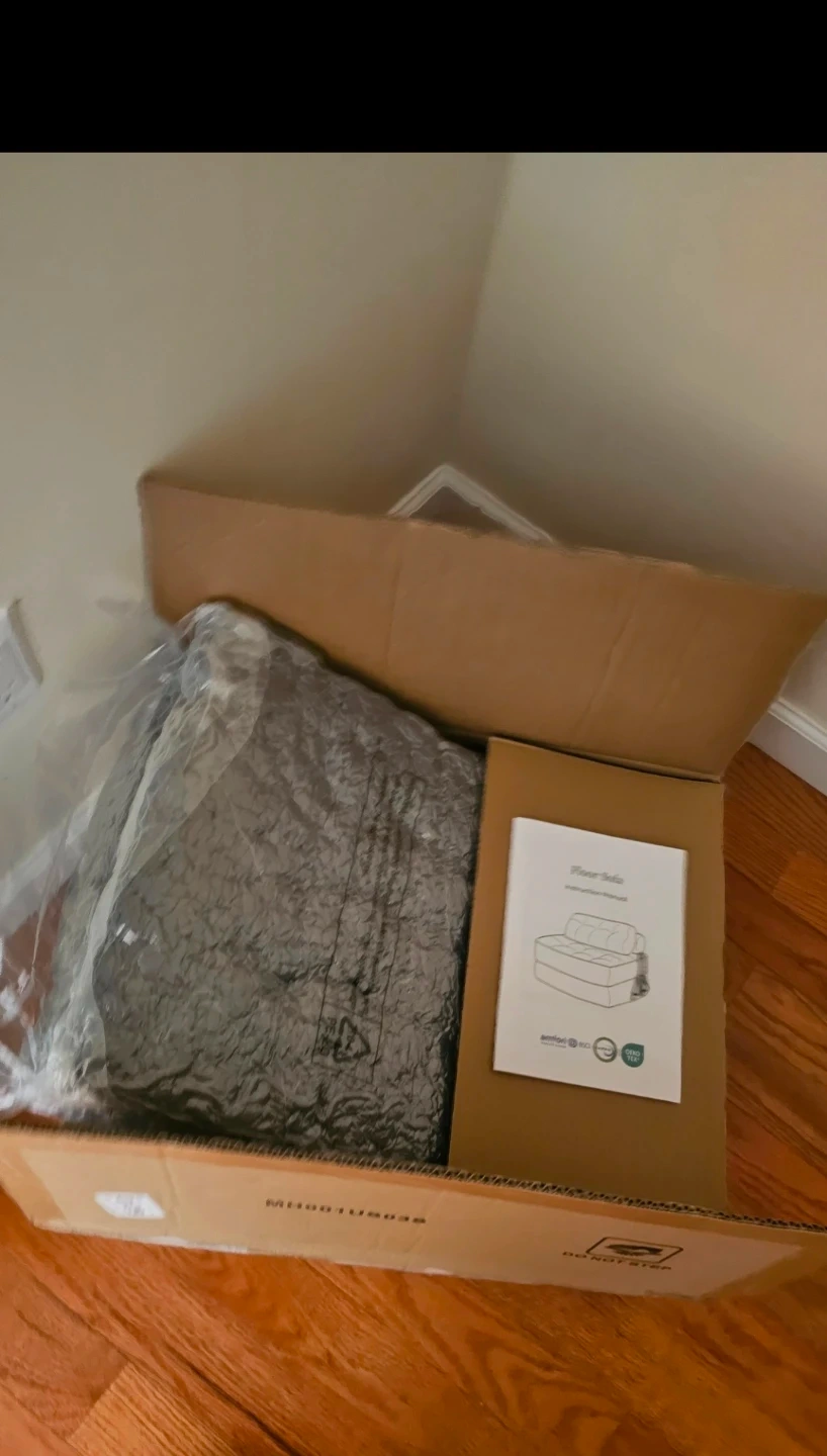 Still in box. This versatile 3-in-1 folding sofa bed is perfect for relaxing! It features a comfortable corded fabric and CertiPUR-US certified shredded foam. The dimensions are approximately 33.5" x 33.5" x 15.7" when folded as a sofa, and 33.5" x 74.8" x 8" when unfolded as a bed. No assembly is required!