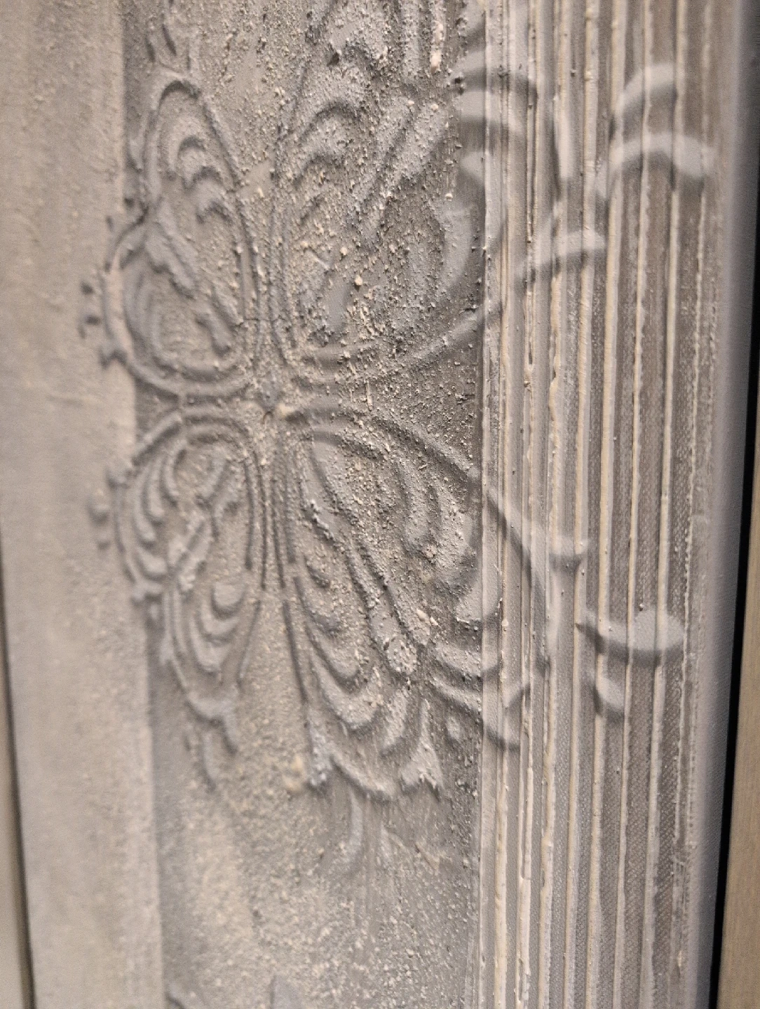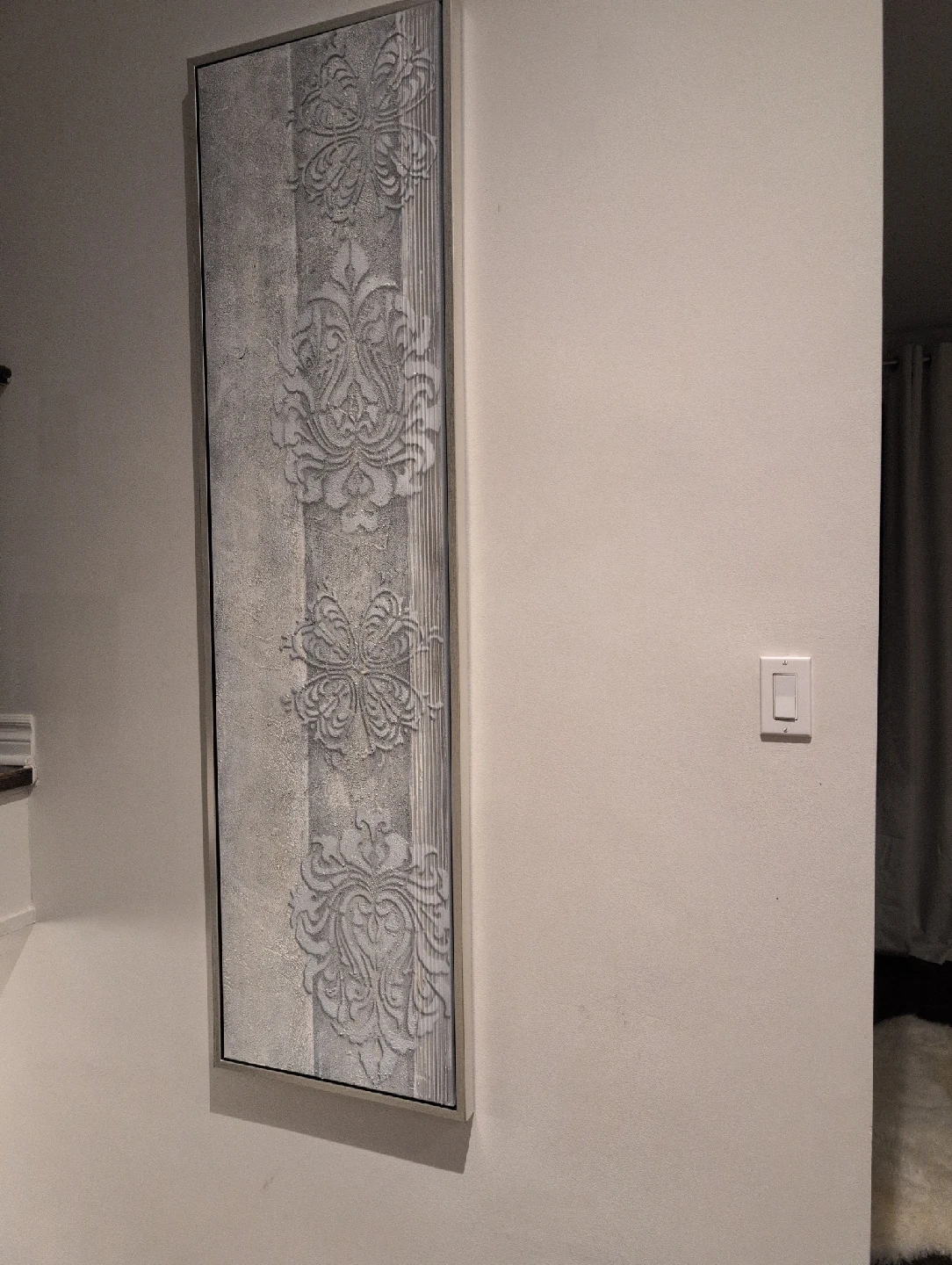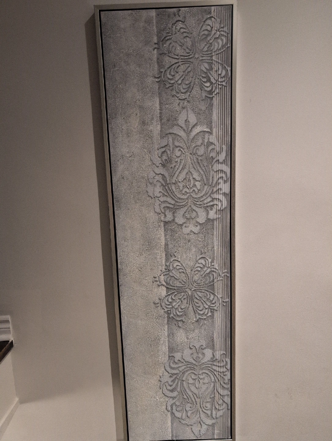 Selling a framed piece of decorative wall art. It features a textured pattern in neutral tones, perfect for adding a touch of elegance to any room. The frame is a sleek silver colour, complementing the artwork nicely. It's in great condition and ready to hang!