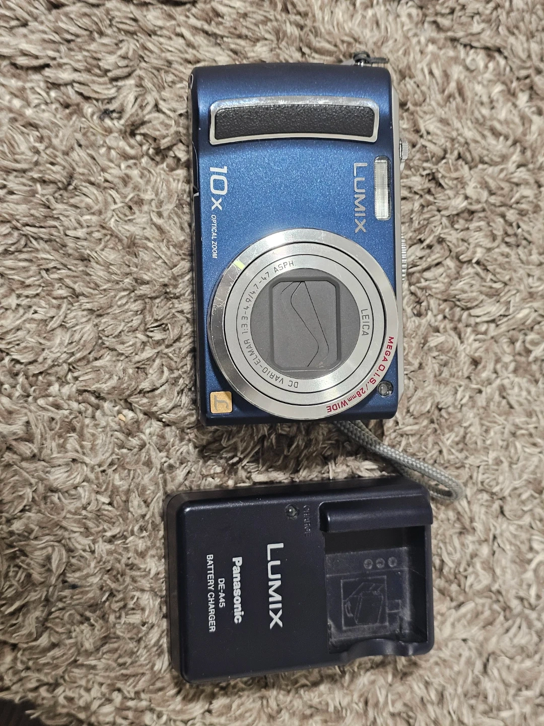 Selling a Panasonic Lumix DMC-TZ5 digital camera in blue. It has 10x optical zoom and comes with a battery charger. Great for capturing memories!
