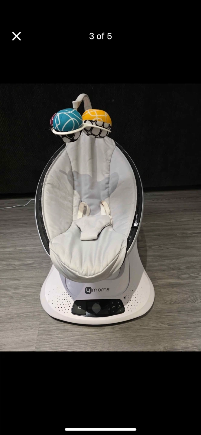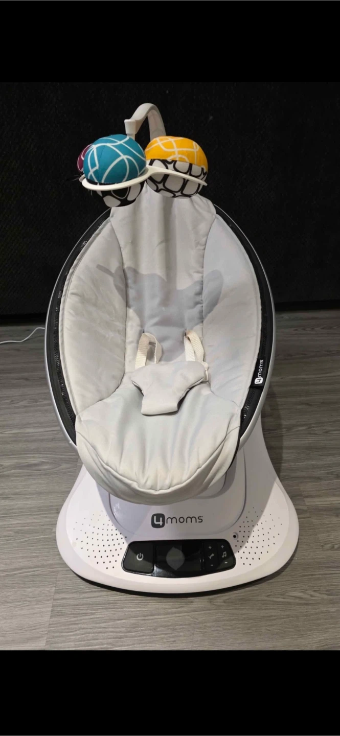 Selling a 4moms MamaRoo baby swing. It's in great condition and ready for a new little one! The swing has multiple motions and speeds to soothe your baby. It also has built-in sounds and can connect to your phone to play music. Perfect for keeping your baby entertained and comfortable