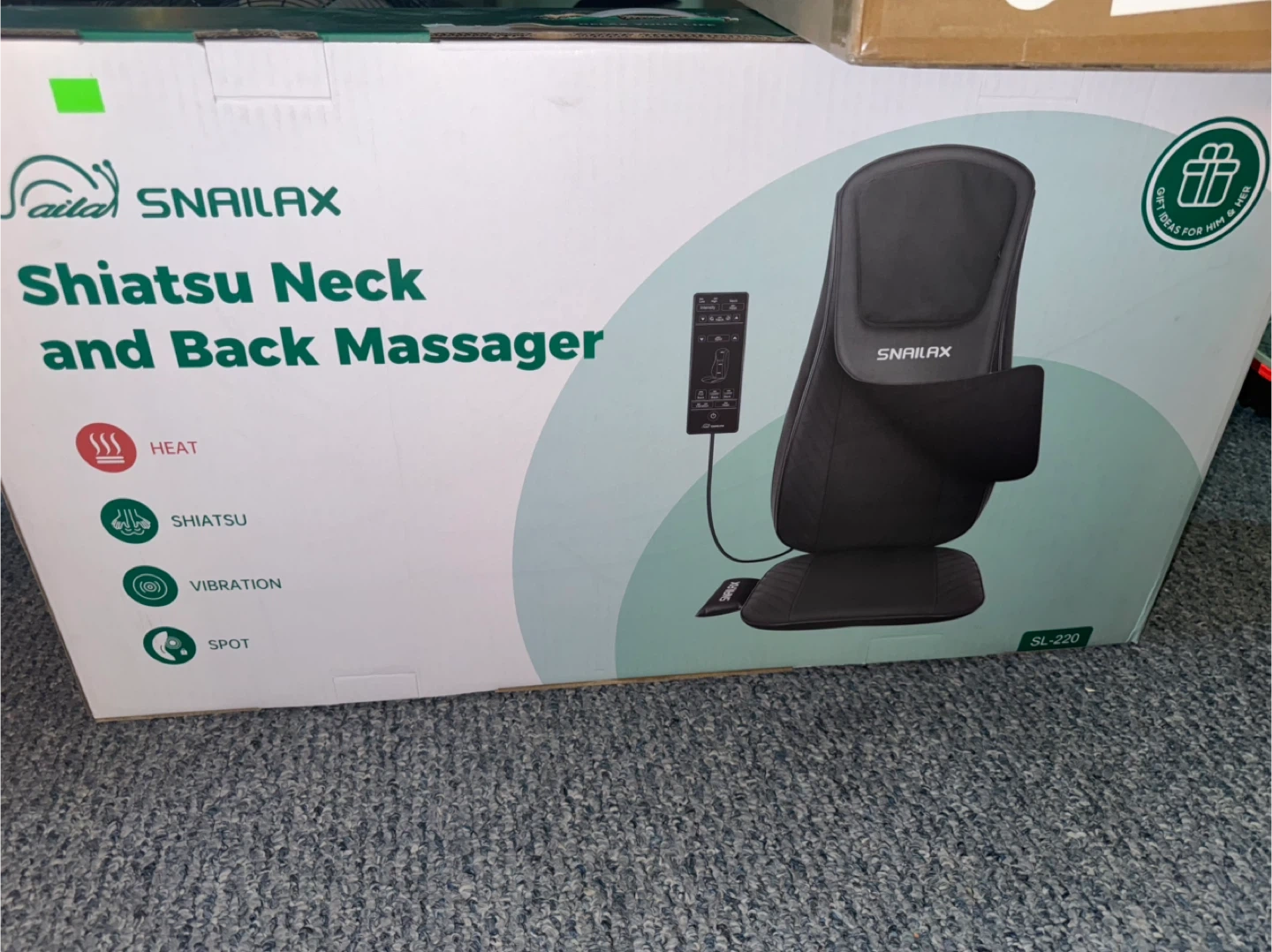 Selling a Snailax Shiatsu Neck and Back Massager. It has heat, shiatsu, vibration, and spot massage functions. Model number SL-220. Great for gift ideas for him and her!