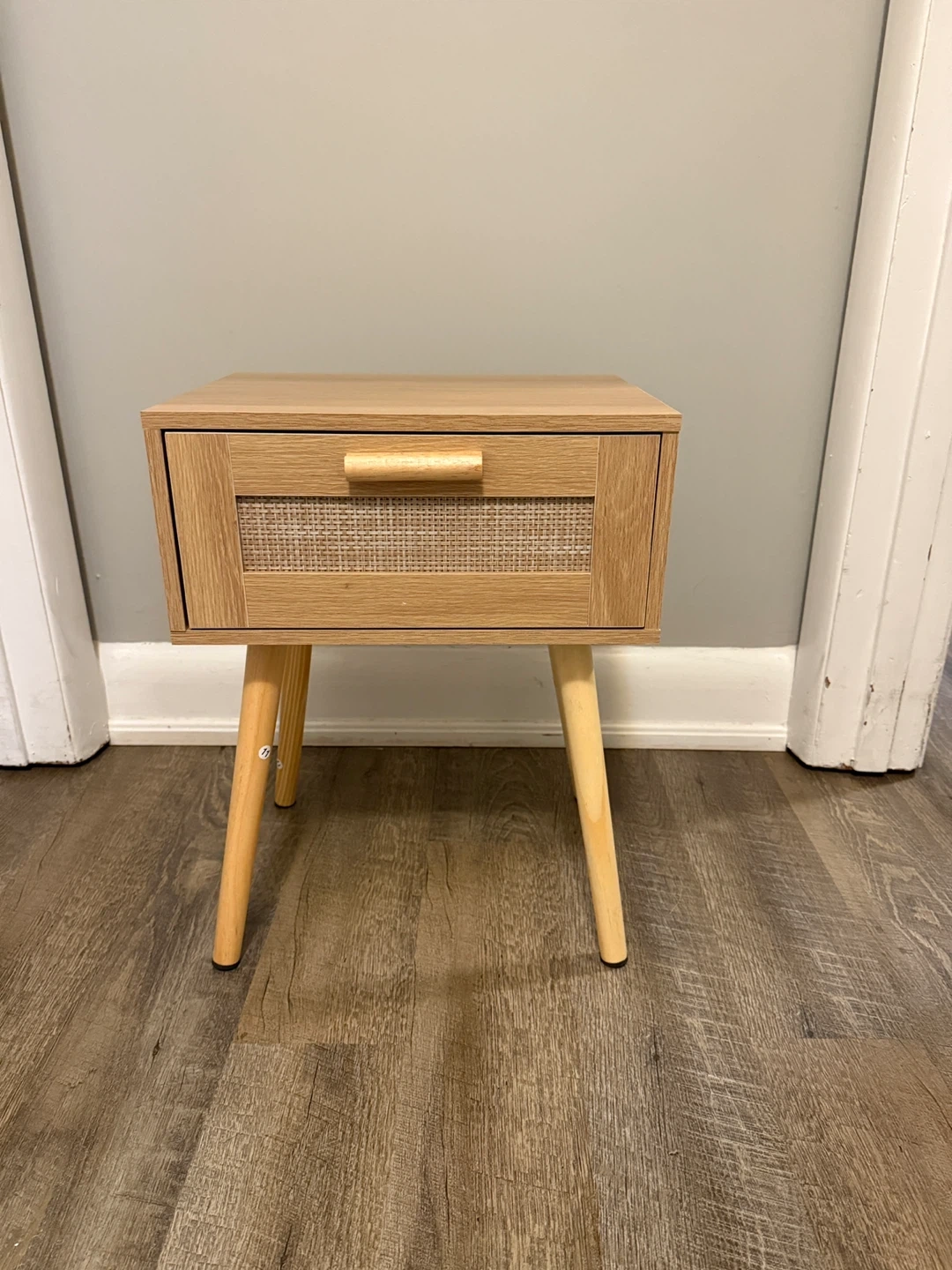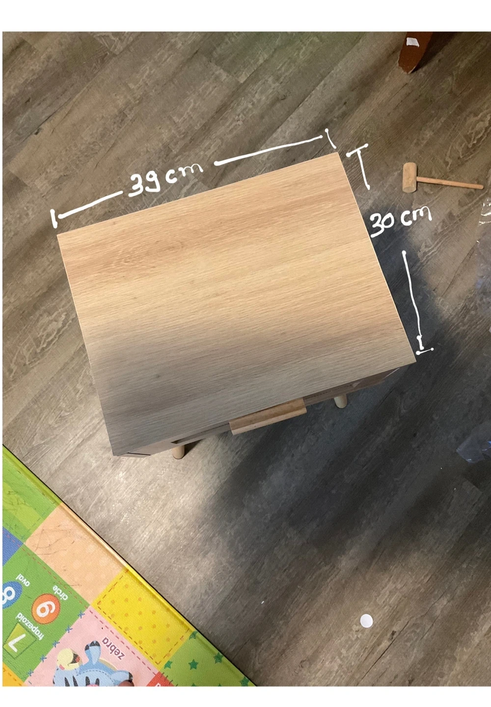 This cute wood end table is perfect as a side table! It features a drawer for storage and is in great condition. The dimensions are approximately 39 cm x 30 cm on top, and it stands about 50 cm tall. Instructions are also included