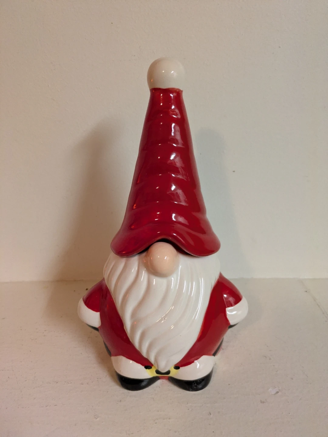 Selling a gnome wearing a Santa hat storage jar. Gnome hat comes off and you can store what you like. Cookie jar perhaps. Measures 11" inch tall.