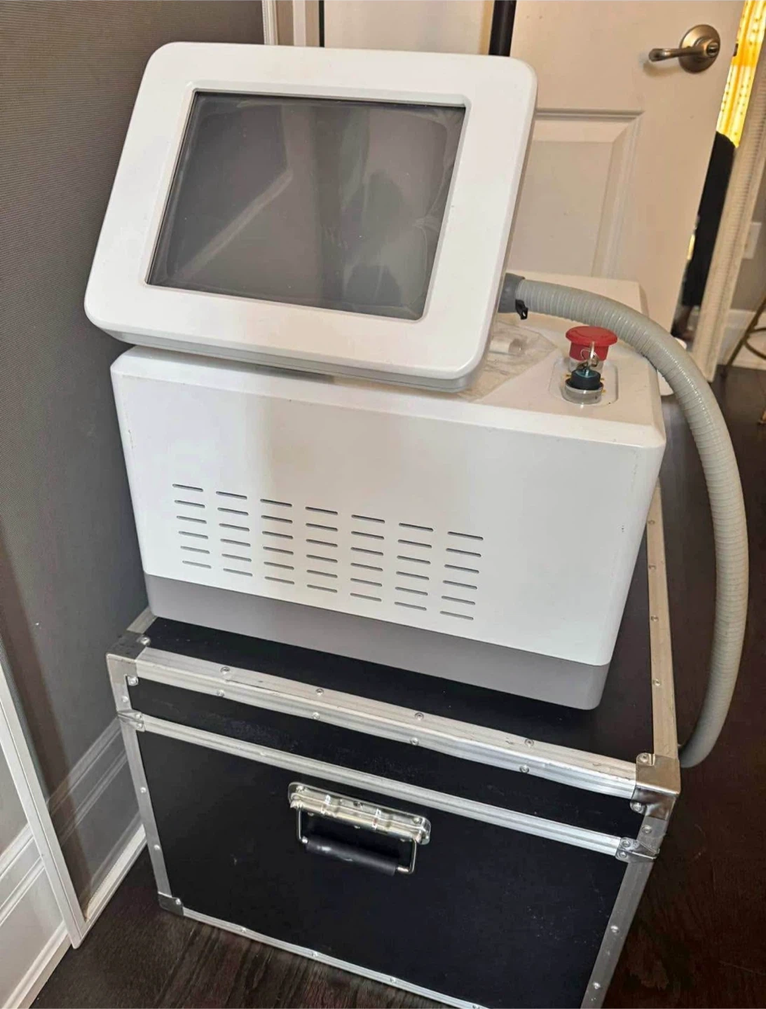 Selling a diode laser hair removal machine. It uses 808/755/1064nm wavelengths and has 3 crystal sizes. It features hair removal and skin rejuvenation functions. The machine is designed for different skin types and parameter settings for various body parts.