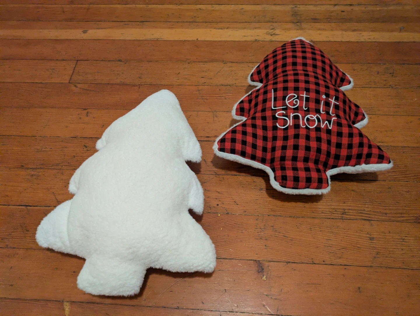 Two puffy plaid and faux sheep throw pillows in the shape of a trees. Has Let it snow engraved on the sides.