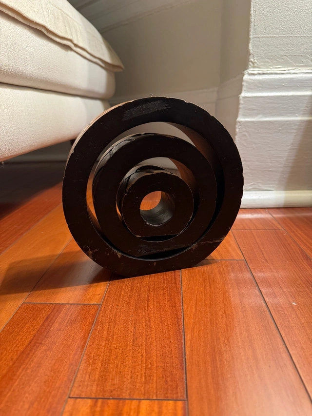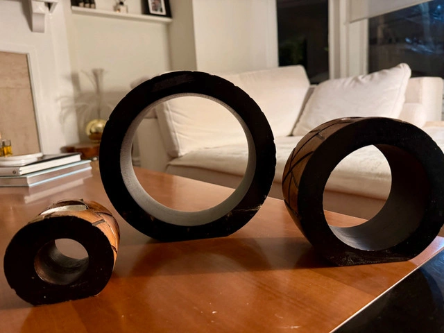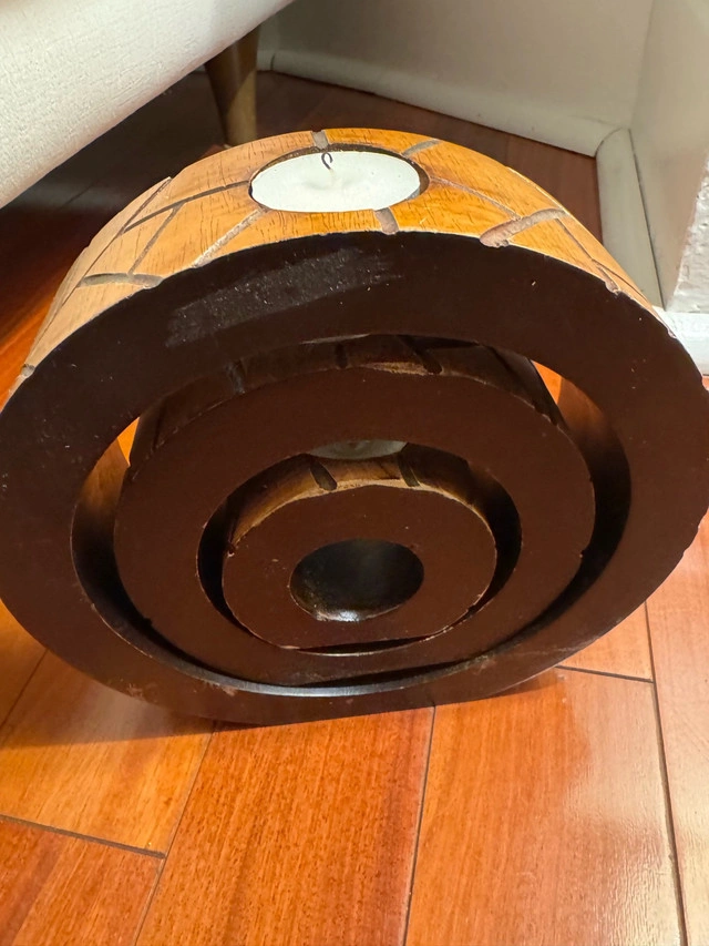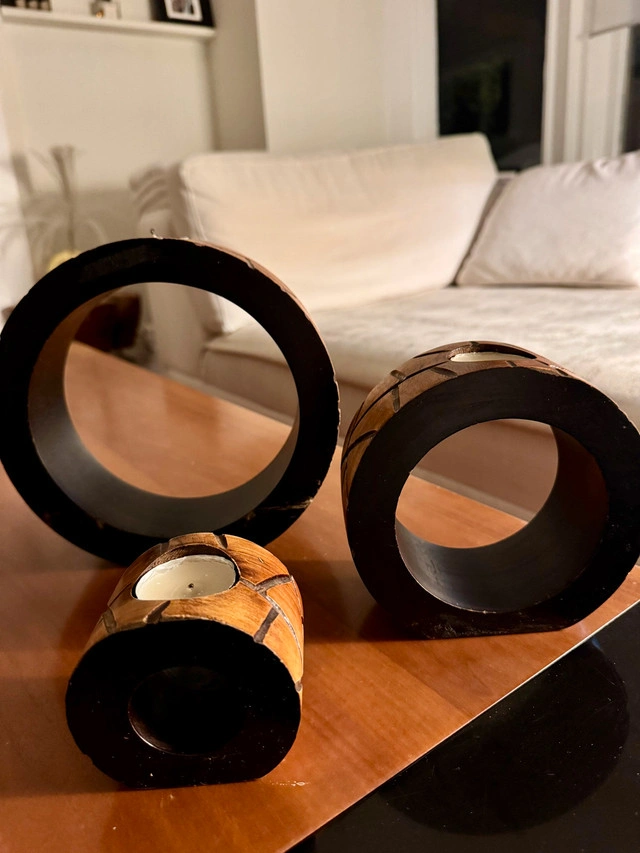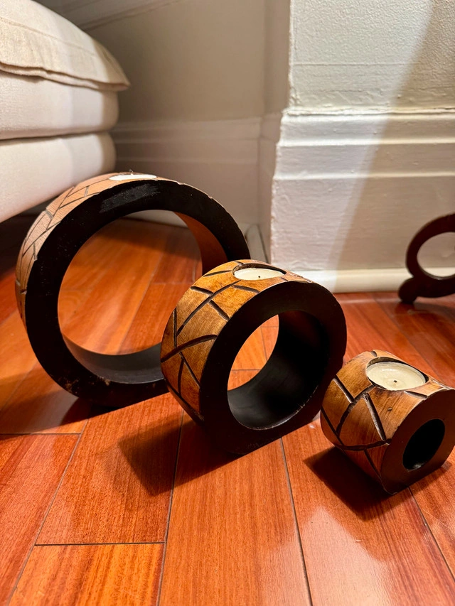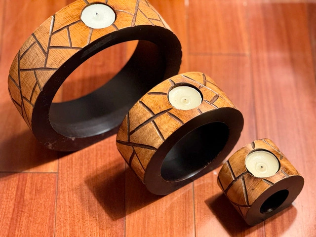 Set of 3 handcrafted wooden candle holders, designed to nest together or display individually. Each holder shows natural wood grain and carries some light scratches and wear from gentle, regular use—these marks only add character and confirm this is an authentic piece of home décor, not a mass‑produced item. Otherwise, each holder remains fully functional and ready for use.