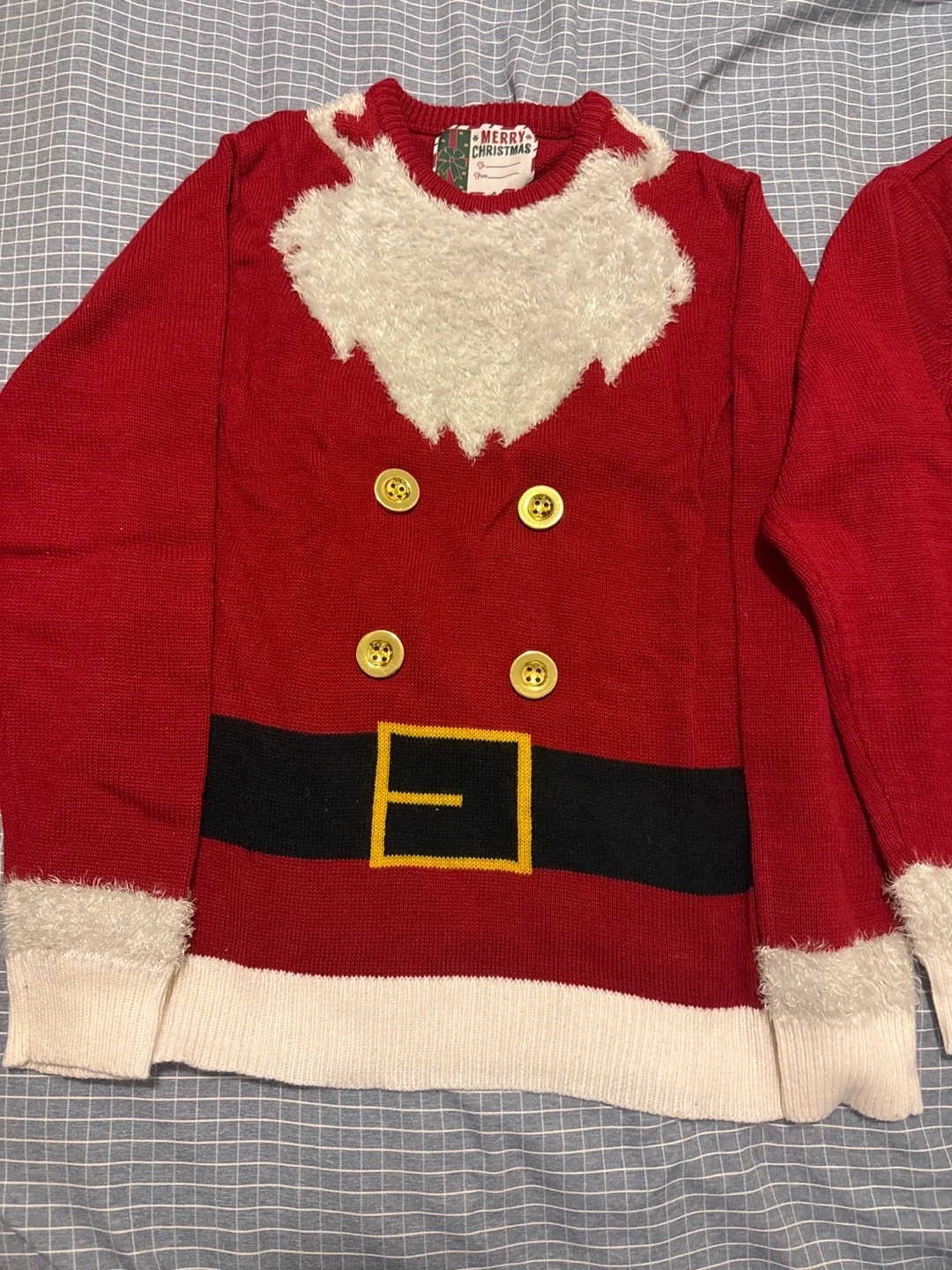 Get ready for the holidays with these fun, matching Santa-themed Christmas sweaters! They're a size medium and perfect for spreading some festive cheer