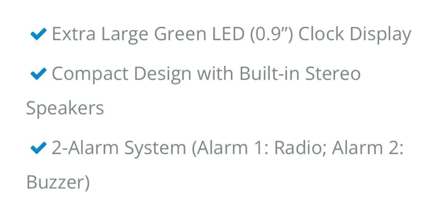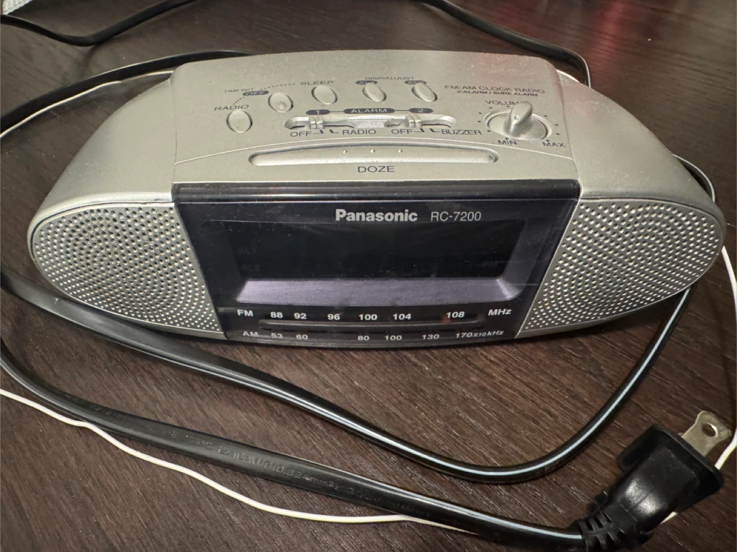 Selling a Panasonic RC-7200 FM-AM clock radio. It features a 2-alarm system (Alarm 1: Radio; Alarm 2: Buzzer). Also has a compact design with built-in stereo speakers and an extra-large green LED (0.9") clock display