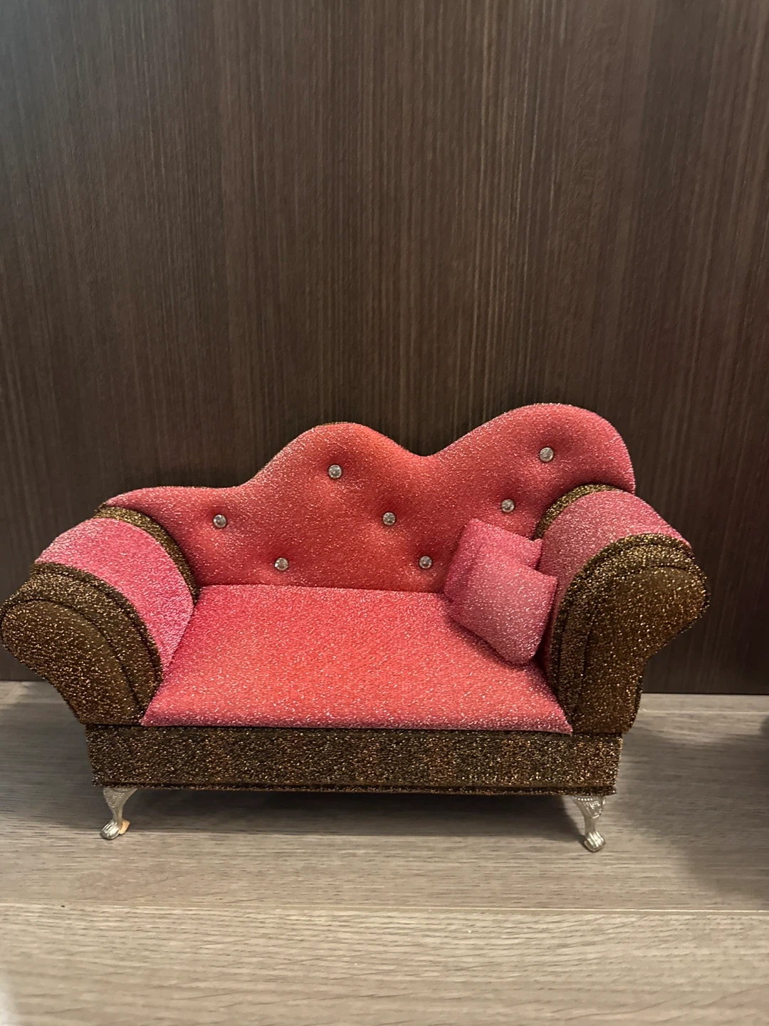 This adorable pink and gold glittery jewelry box is in great condition! It's perfect for storing your rings, necklaces, and other small treasures. It would also make a cute decorative piece for your dresser or vanity