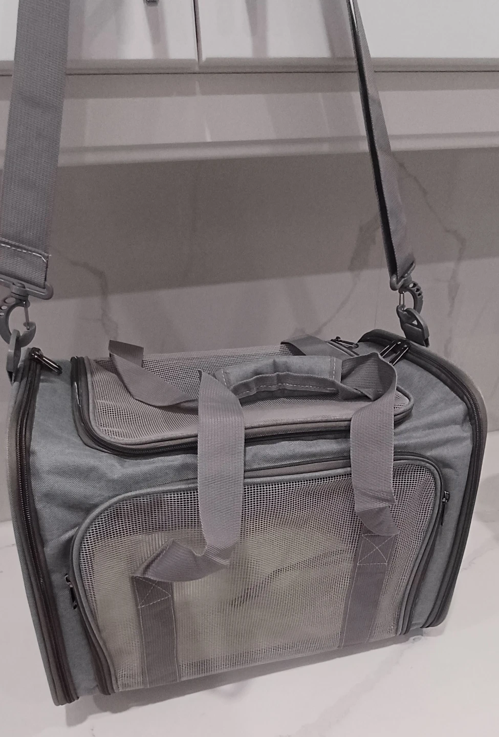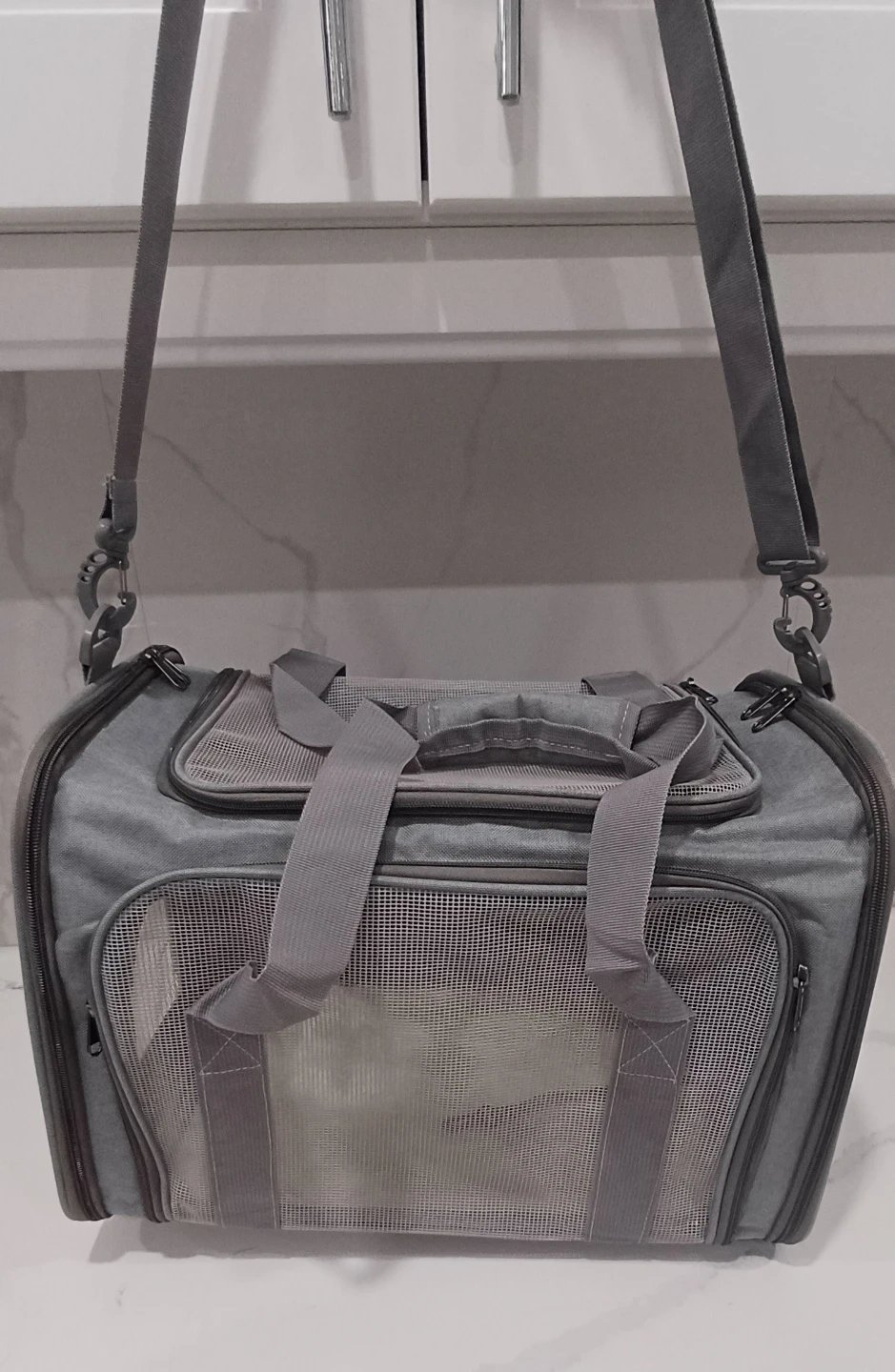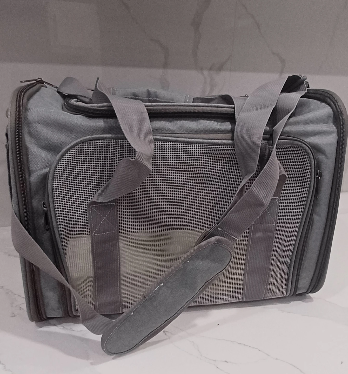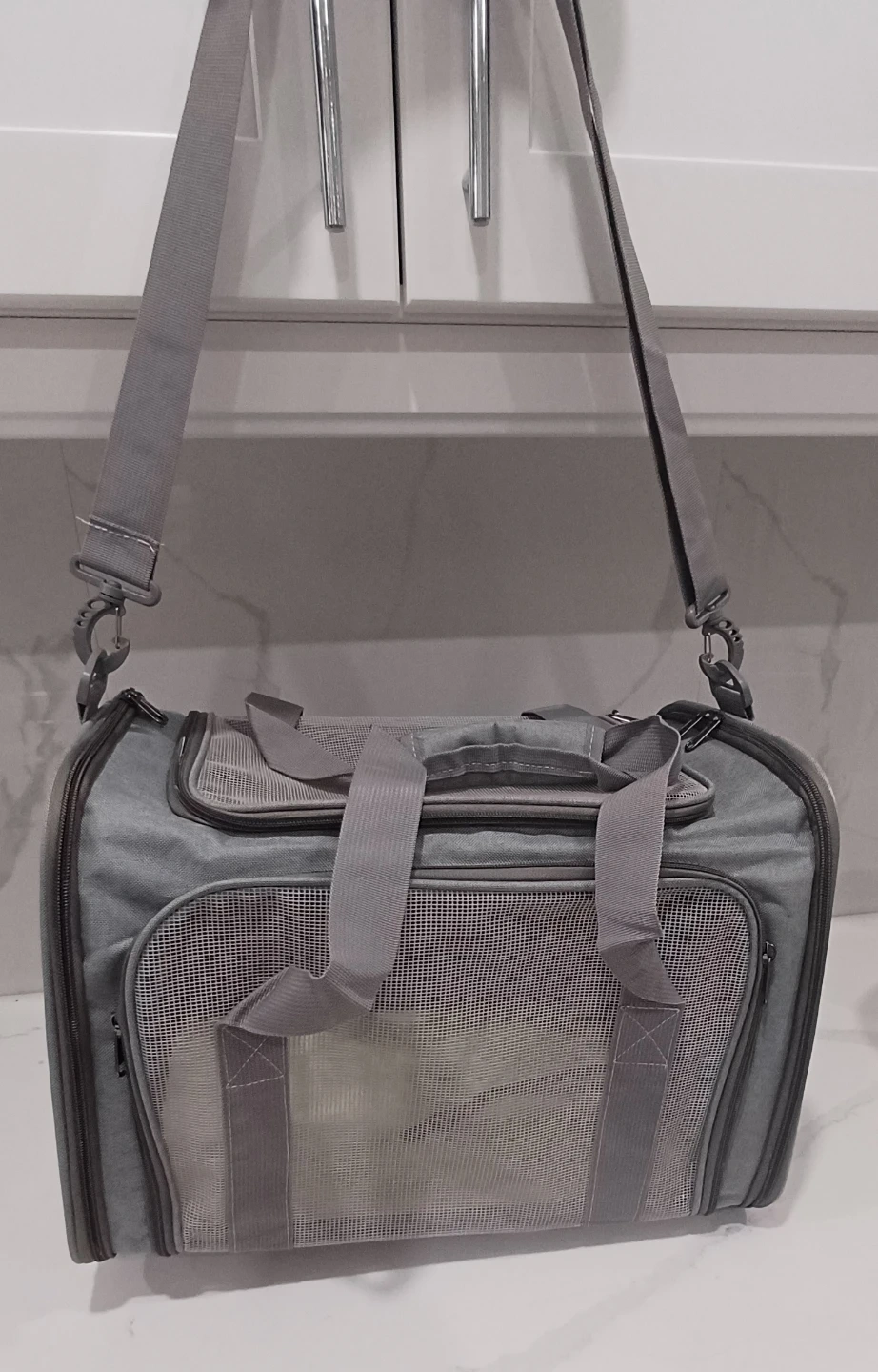 28Selling a grey pet carrier in great condition. It has a shoulder strap for easy carrying and mesh windows for ventilation. Perfect for vet visits or travel. Measurement : 17x11x11