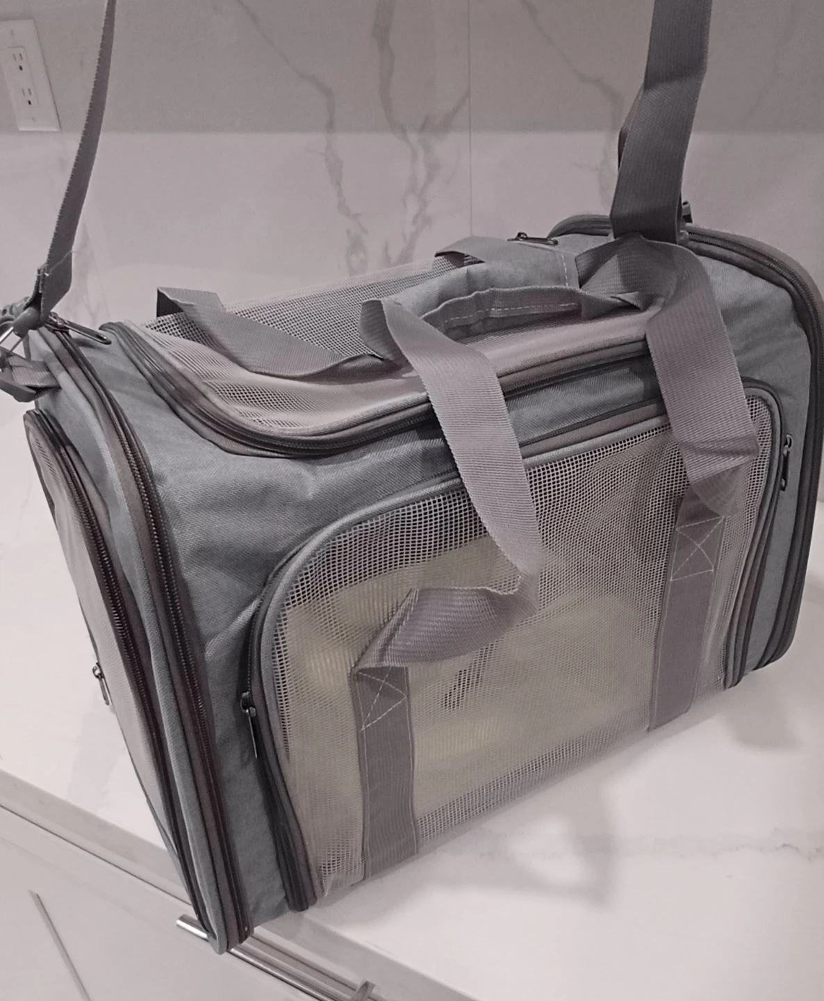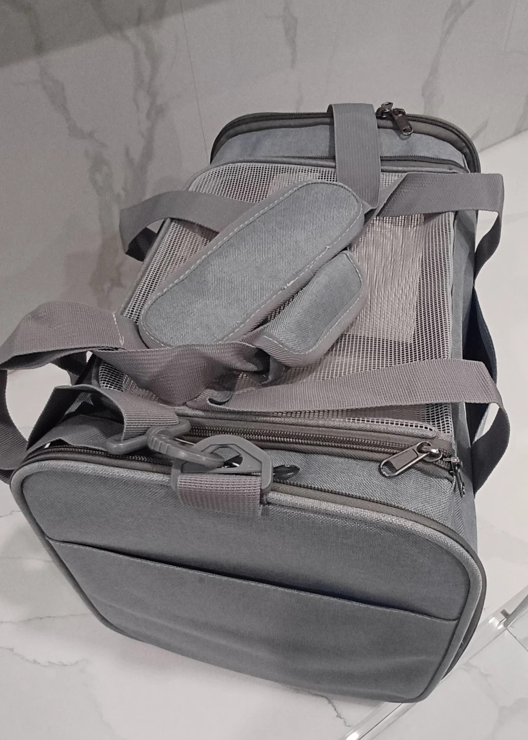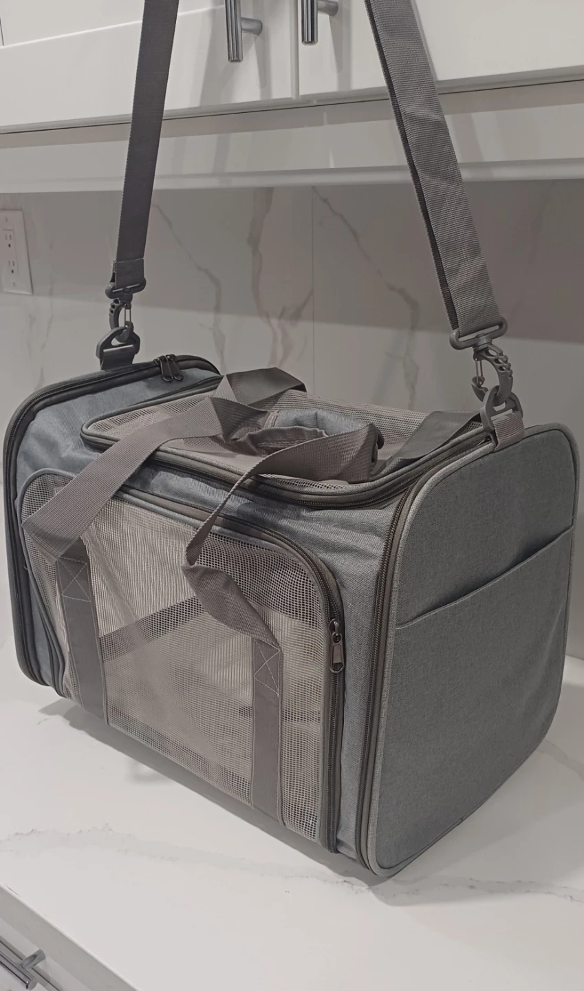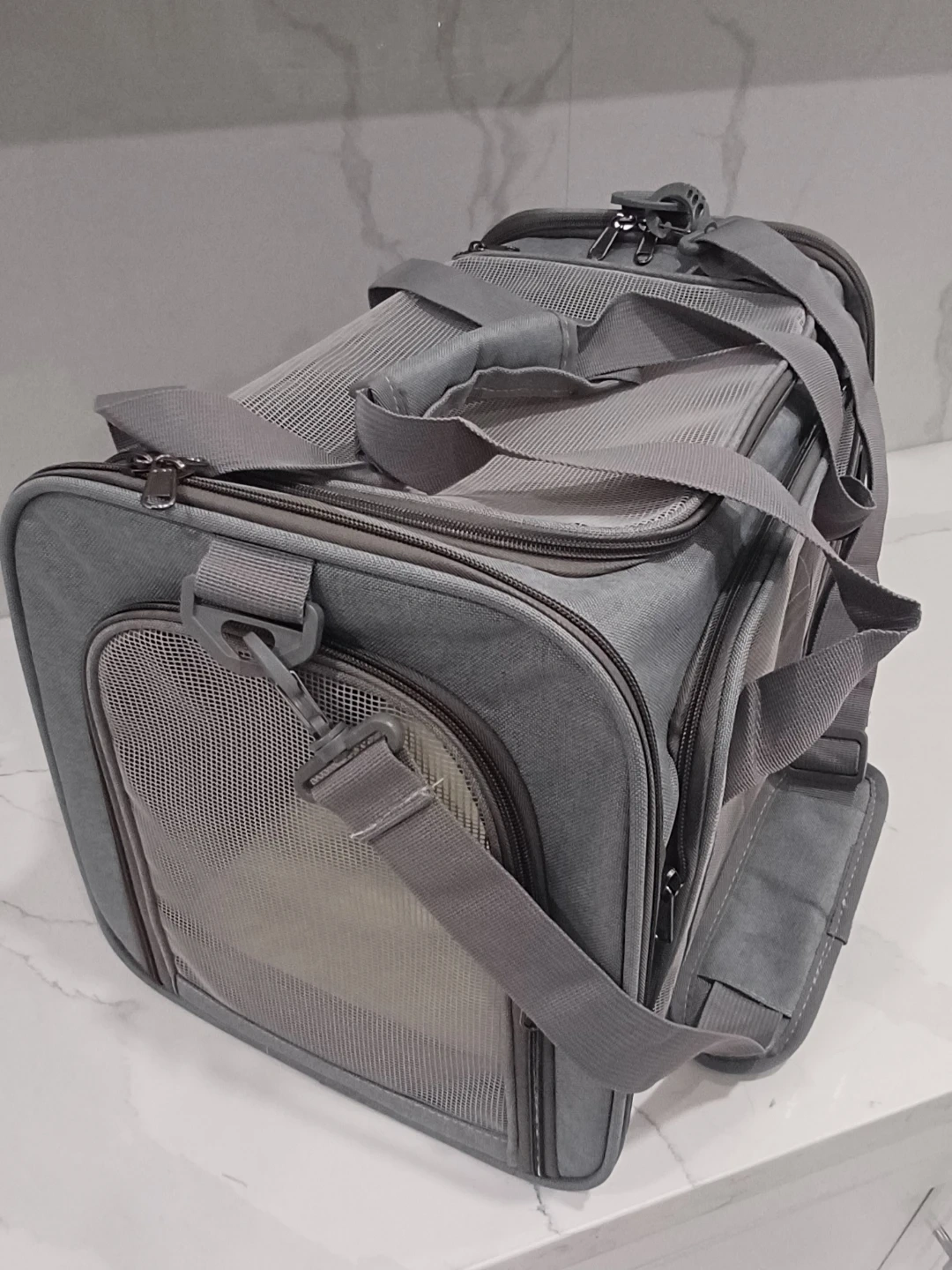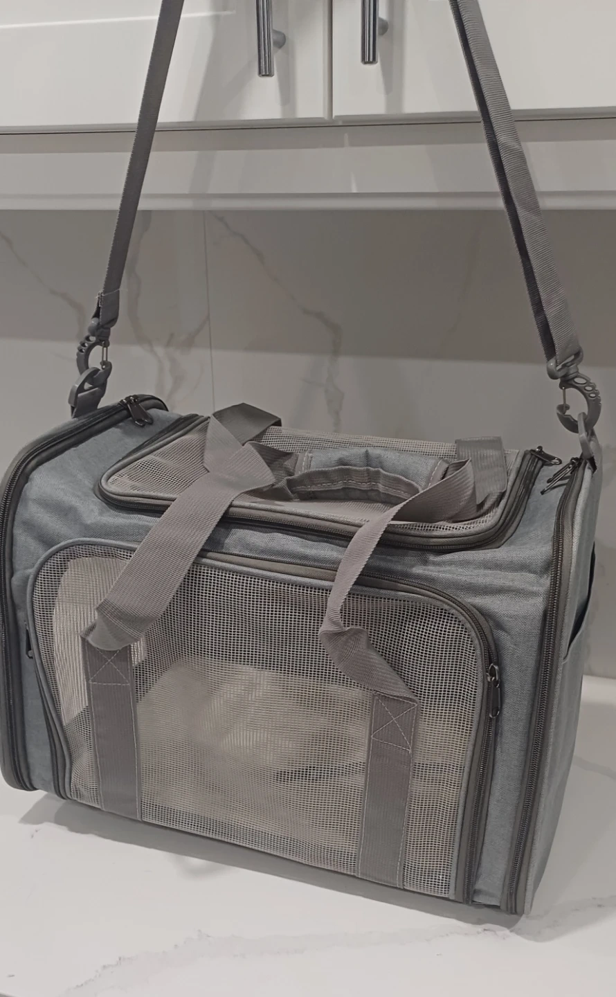 28Selling a grey pet carrier in great condition. It has a shoulder strap for easy carrying and mesh windows for ventilation. Perfect for vet visits or travel. Measurement : 17x11x11