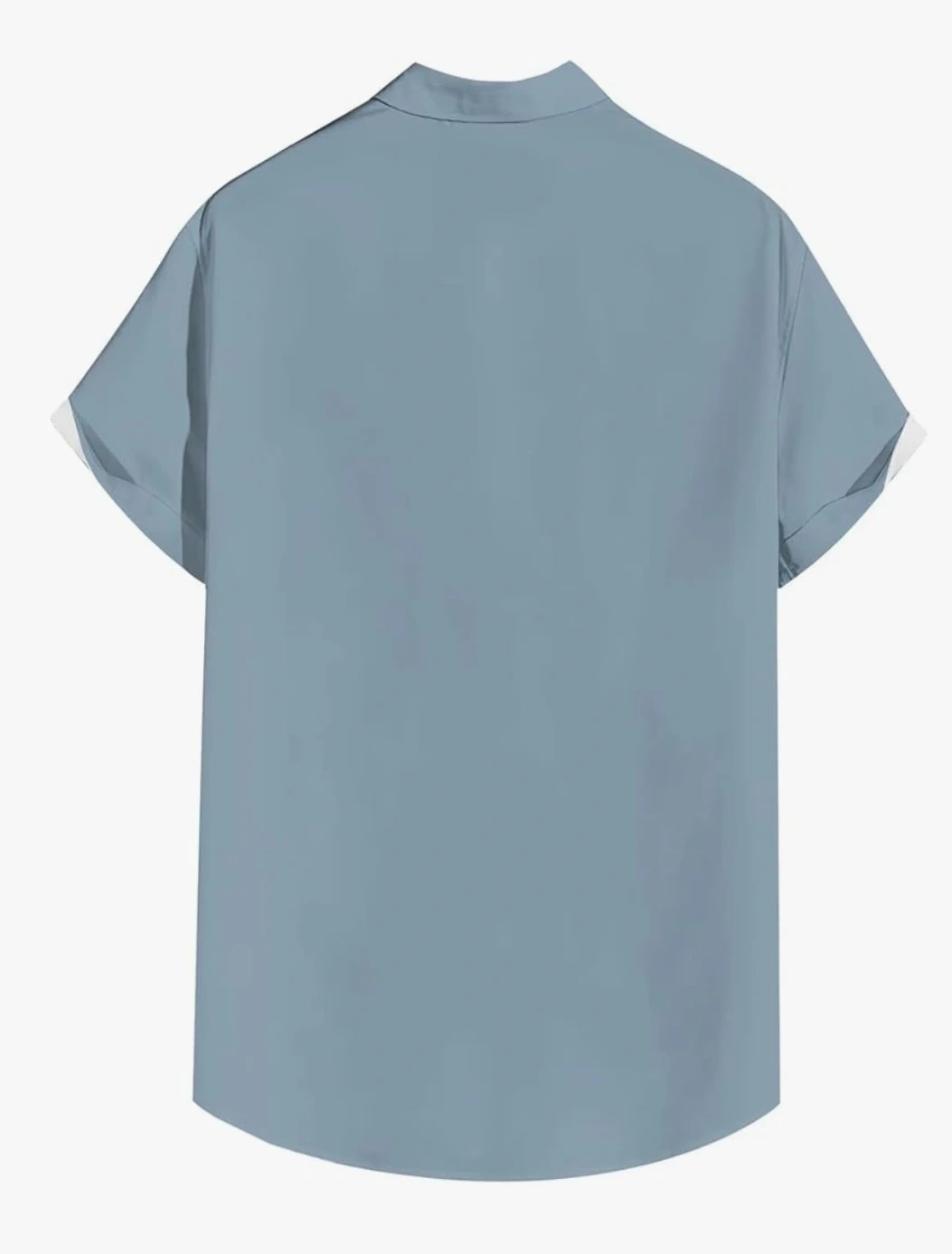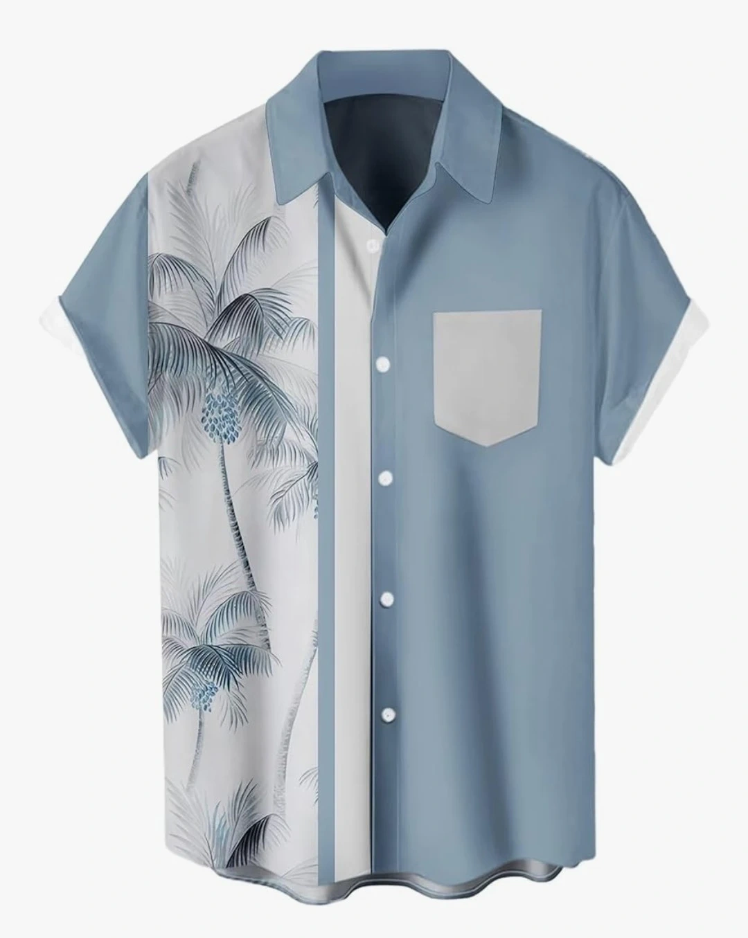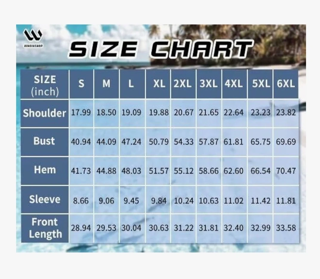 This is a WINQINSHOP men's shirt featuring a palm tree print design. It's a short-sleeved shirt with a button-up front and a pocket on the chest. The colour is a light blue and white combination. Please refer to the size chart image to find the measurements for the sizes.