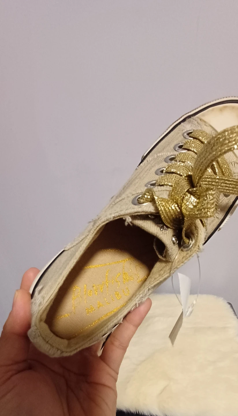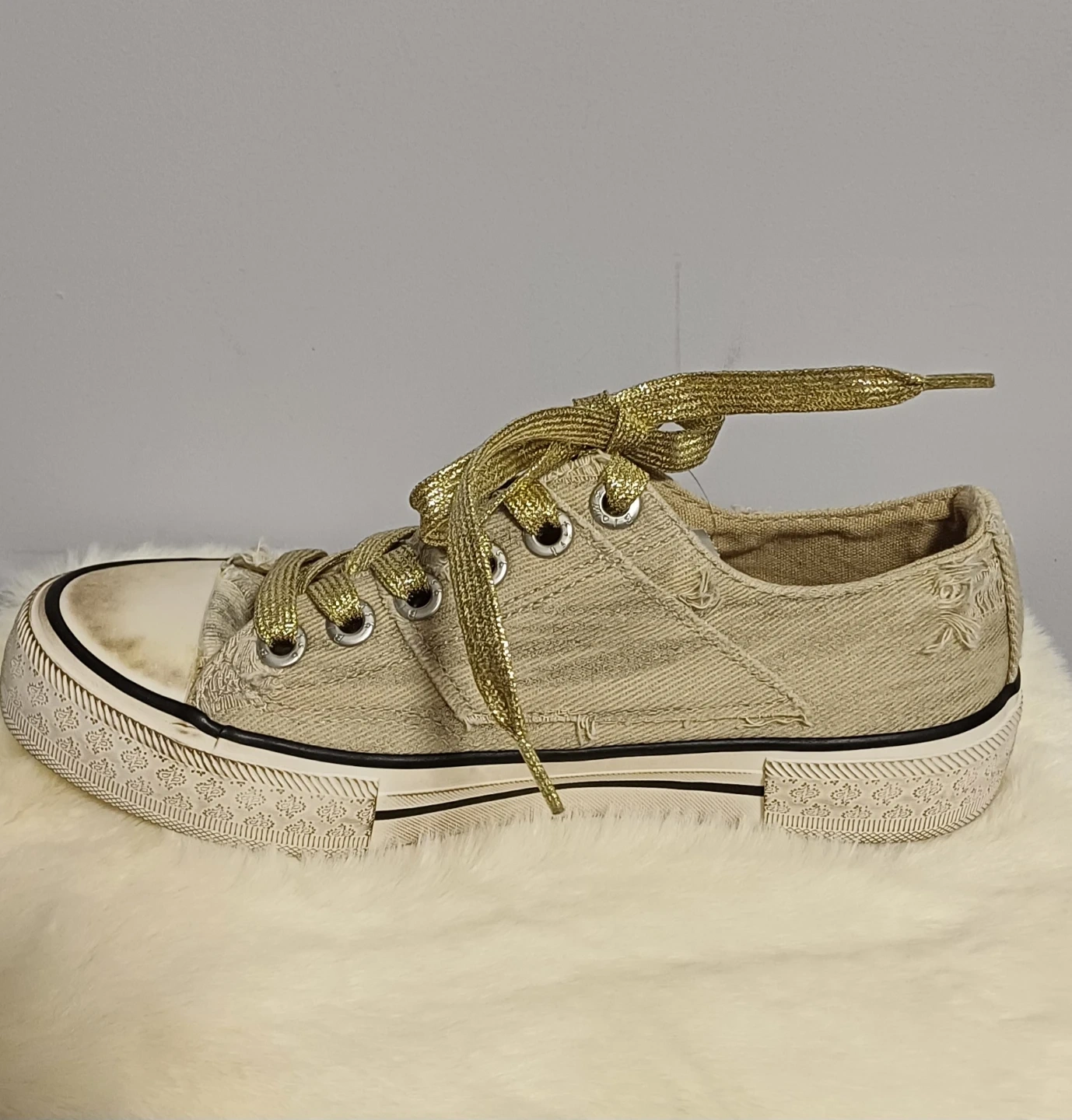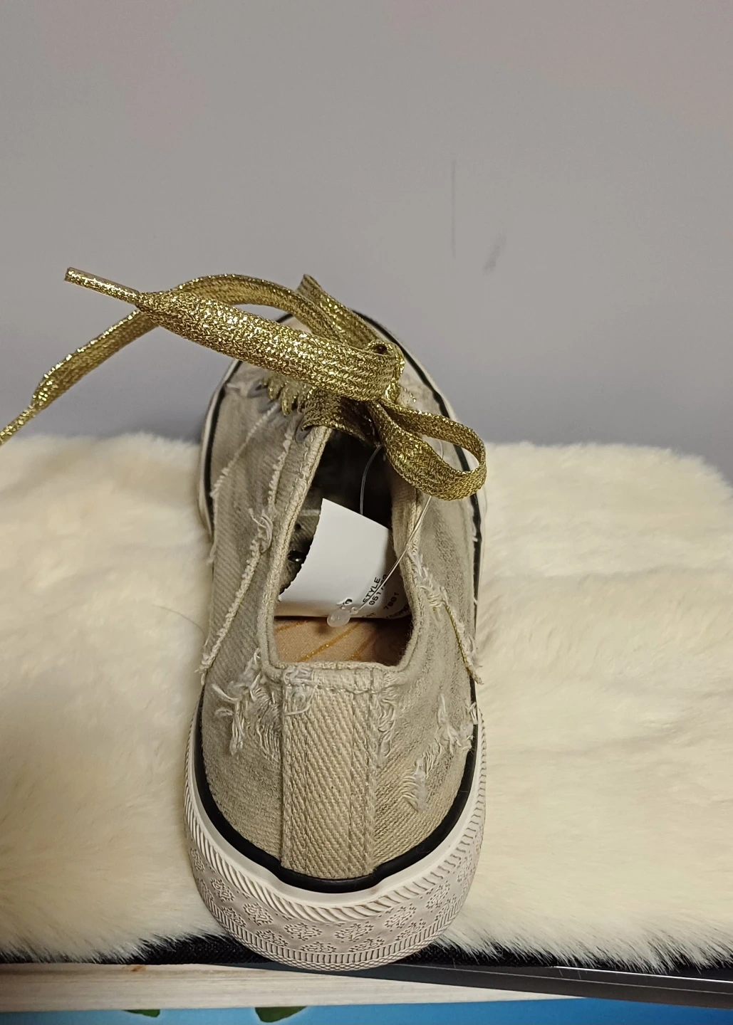 Blowfish Malibu Womens Fashion Sneaker. A pair of canvas sneakers in size 7. They have gold glitter laces and a distressed look. Great for a casual outfit!