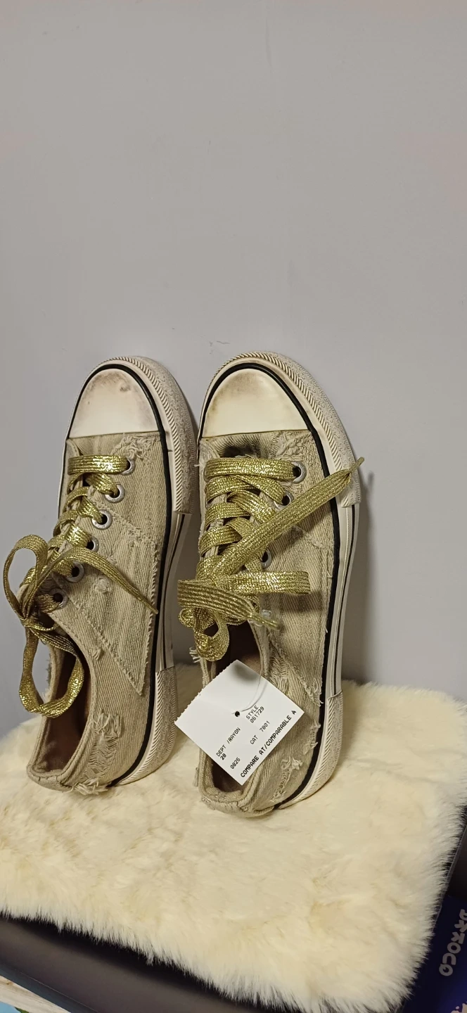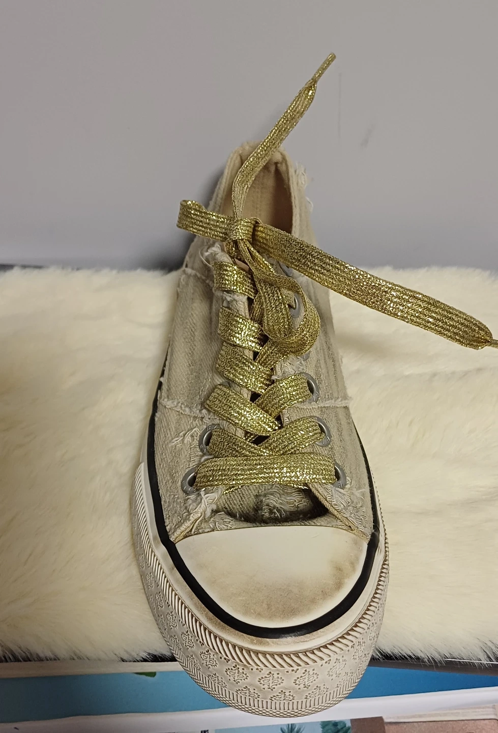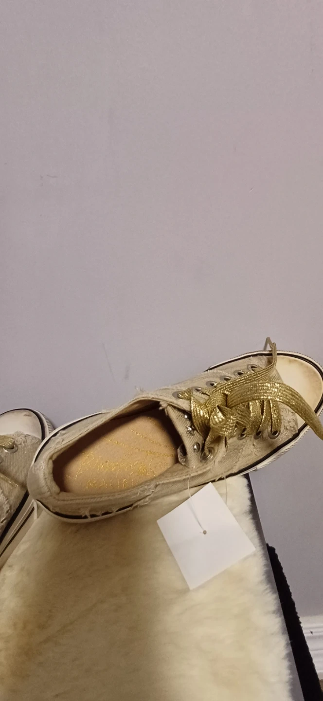 Blowfish Malibu Womens Fashion Sneaker. A pair of canvas sneakers in size 7. They have gold glitter laces and a distressed look. Great for a casual outfit!