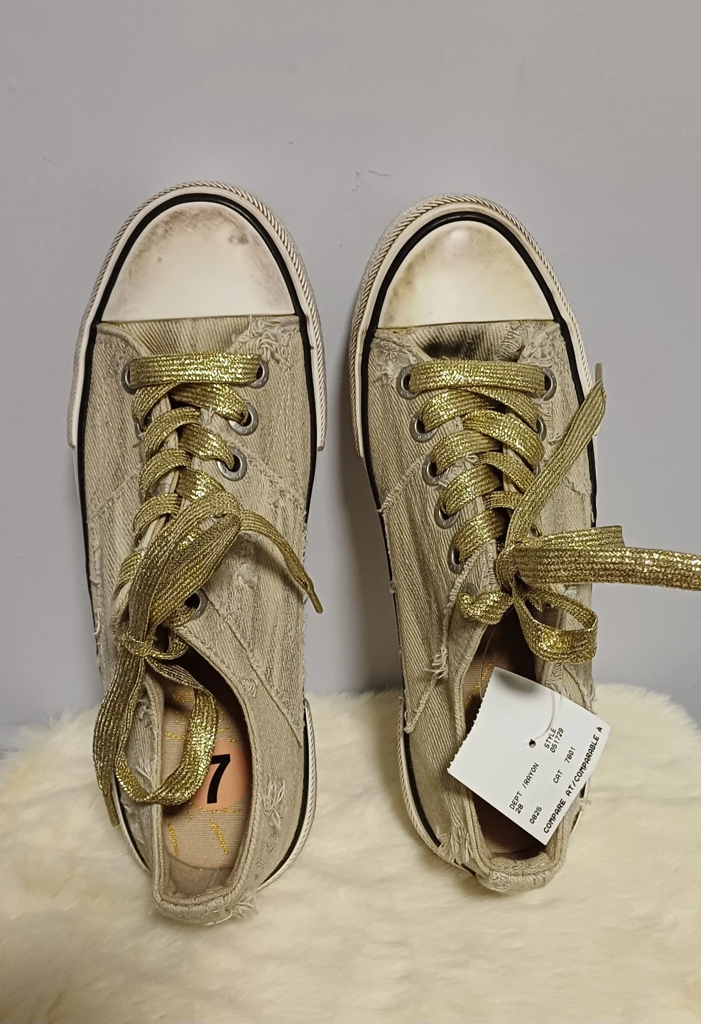 Blowfish Malibu Womens Fashion Sneaker. A pair of canvas sneakers in size 7. They have gold glitter laces and a distressed look. Great for a casual outfit!