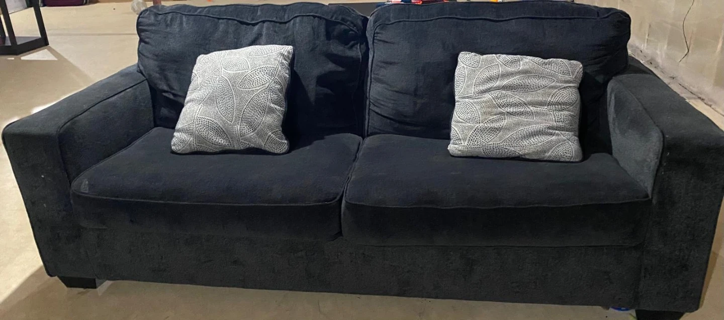 Dark grey king size sofa bed in good condition! Perfect for extra guests or a cozy night in. Comes with decorative pillows as shown in the pictures