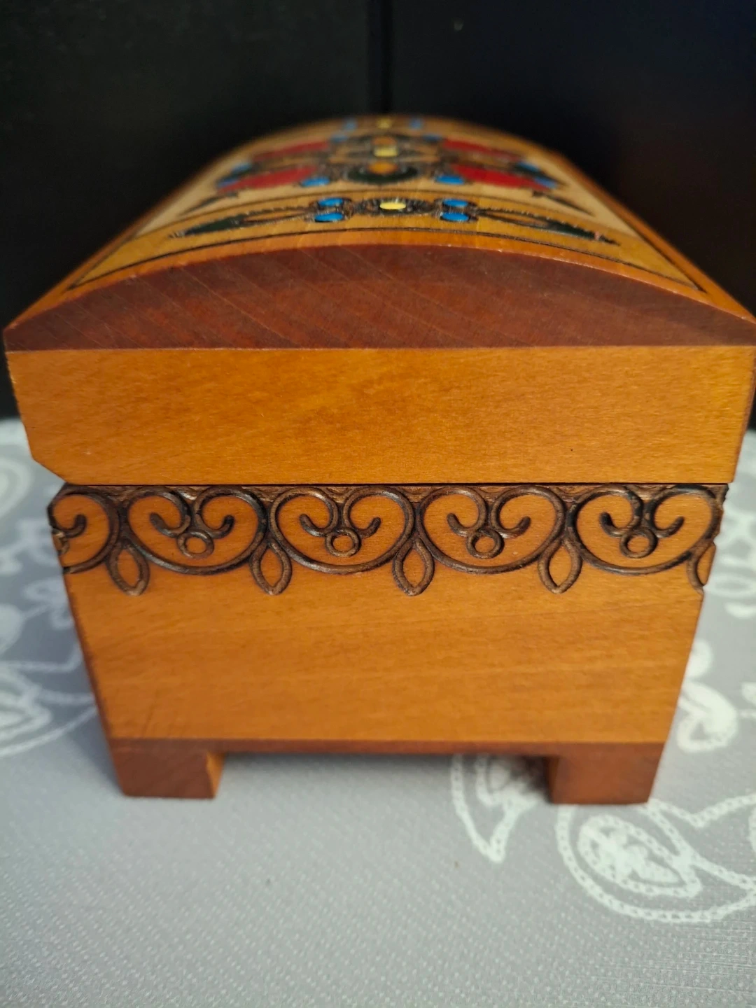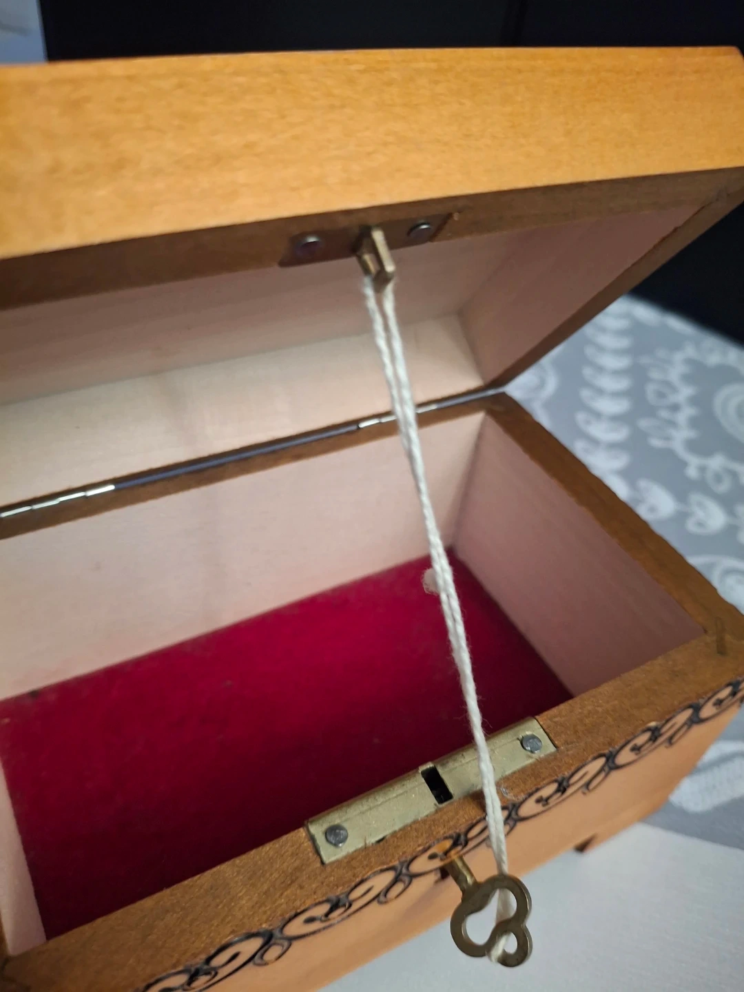 15Selling a charming handmade wooden trinket box! It features lovely floral carvings on the top and sides, with a red felt lining inside. It comes with a small key to keep your treasures safe and sound