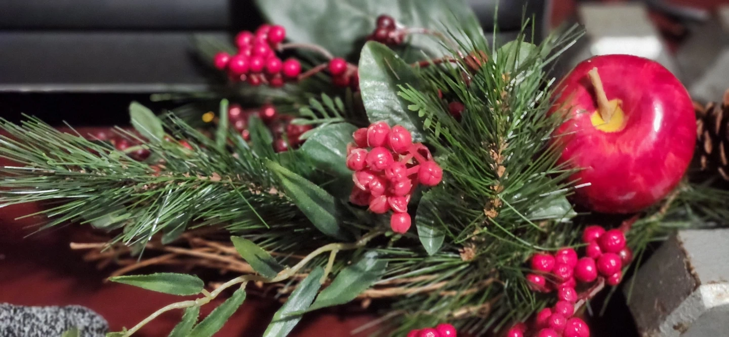 573A festive Christmas garland featuring pine needles, red berries, and a bright red apple