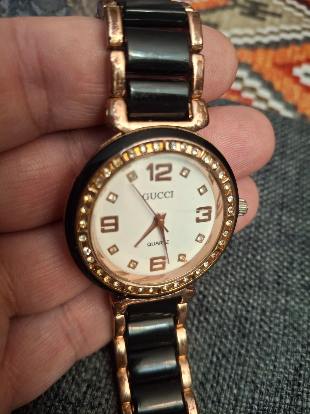 15Selling a Gucci ladies watch with a quartz movement. It features a rose gold finish with black accents on the band. The face has a mother-of-pearl look with crystal detailing around the bezel. The back is stainless steel. The bracelet is worn out
