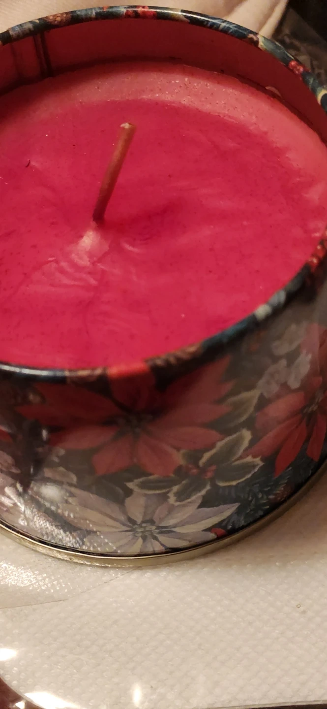 573A red candle in a decorative tin with a floral design. Perfect for adding a cozy touch to any room