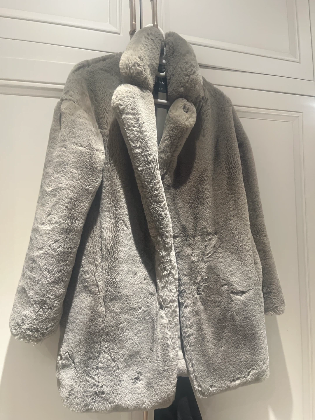 Selling a cozy grey faux fur coat! It's in great condition and perfect for staying warm during the colder months. A stylish addition to any wardrobe!