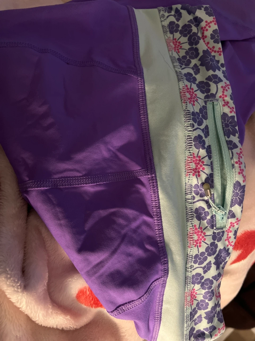 Selling a pair of Lululemon crop leggings in a lovely shade of purple! They're in great condition and feature a cute floral patterned waistband. Perfect for workouts or just lounging around!