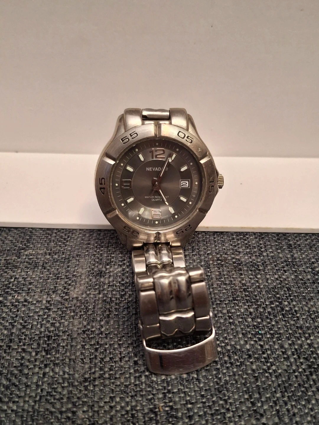 15Selling a Nevada water-resistant quartz watch. It has a metal band and a date display.