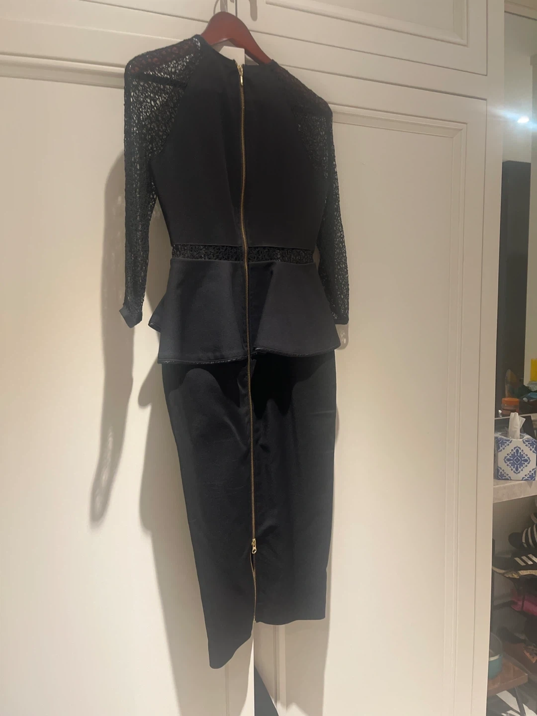 A stylish black dress featuring lace sleeves and a flattering peplum waist design. It's in new condition worn once - As seen on Sophie Trudeau