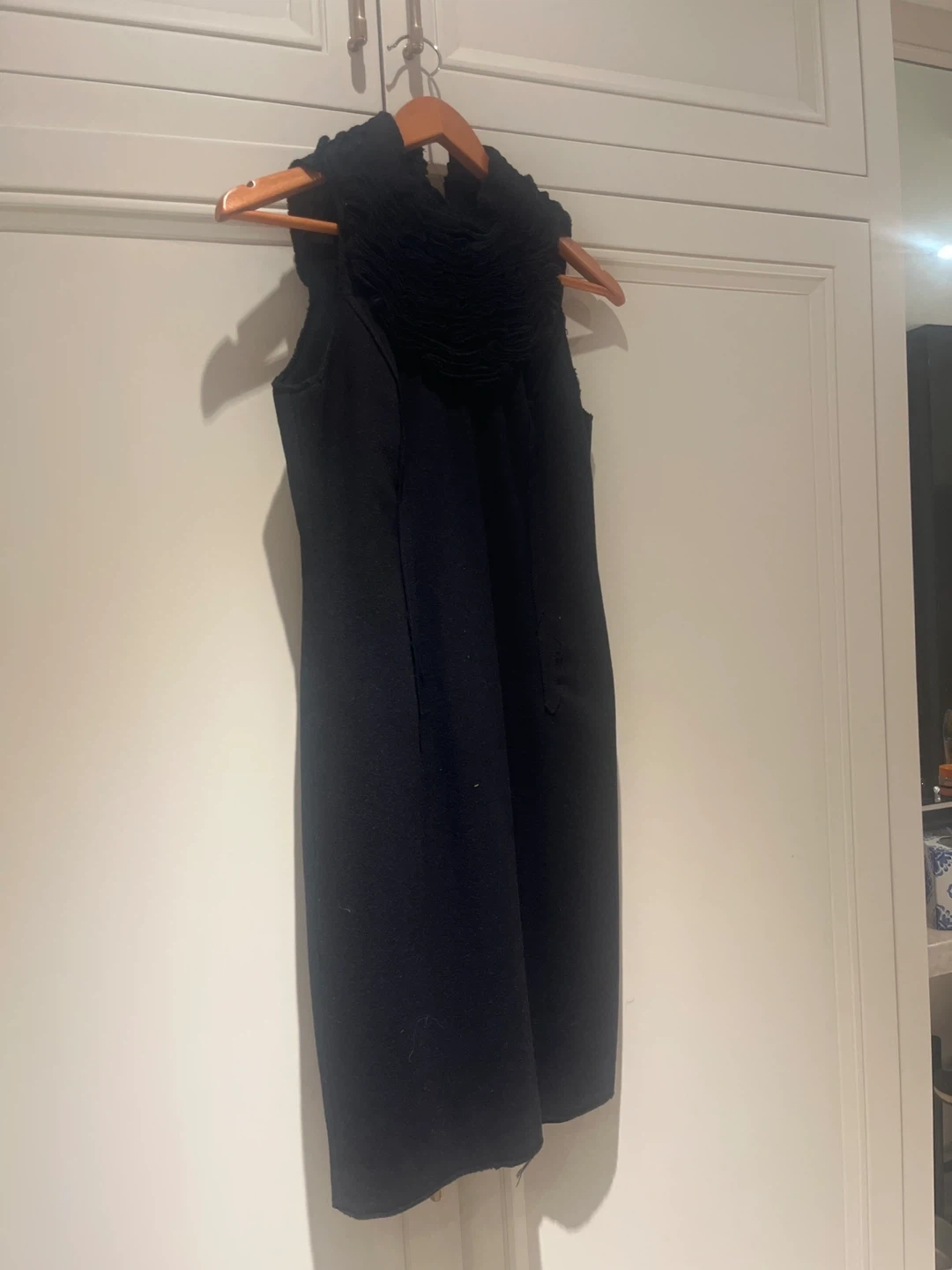 Selling a black sleeveless dress in great condition! It has a unique ruffled neckline that adds a touch of elegance. Perfect for the holidays