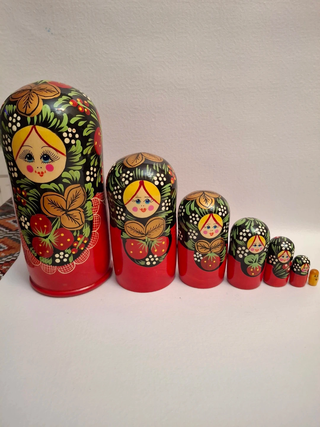 15These are a set of Russian nesting dolls, also known as Matryoshka dolls! They are in great condition and feature a colourful floral and berry design on a red and black background. A fun and unique decorative item!