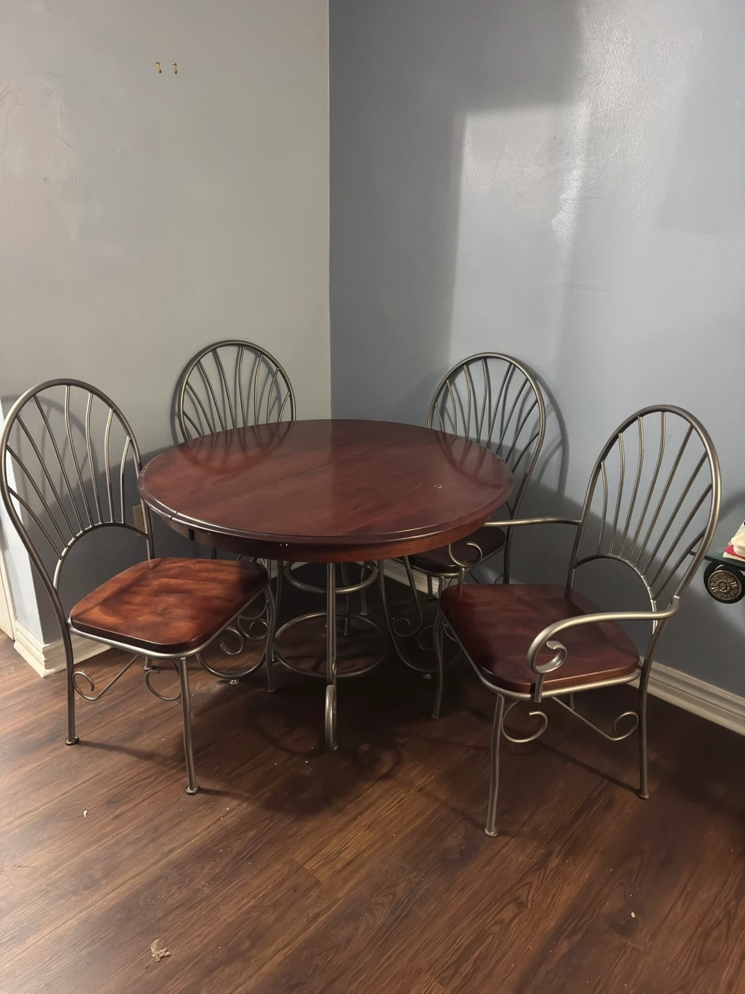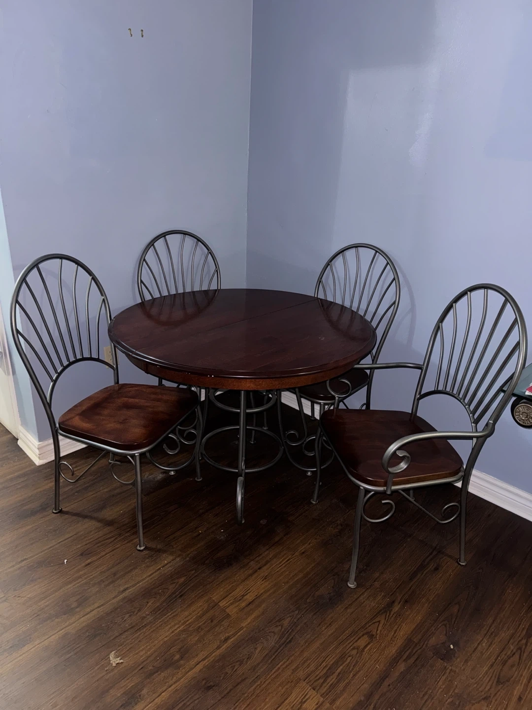 Selling a dining table with four matching chairs. The table has a round, dark wood top and a metal base. The chairs have a similar wood seat and metal frame with a decorative back. It's in good condition and would be a great addition to any dining room or kitchen