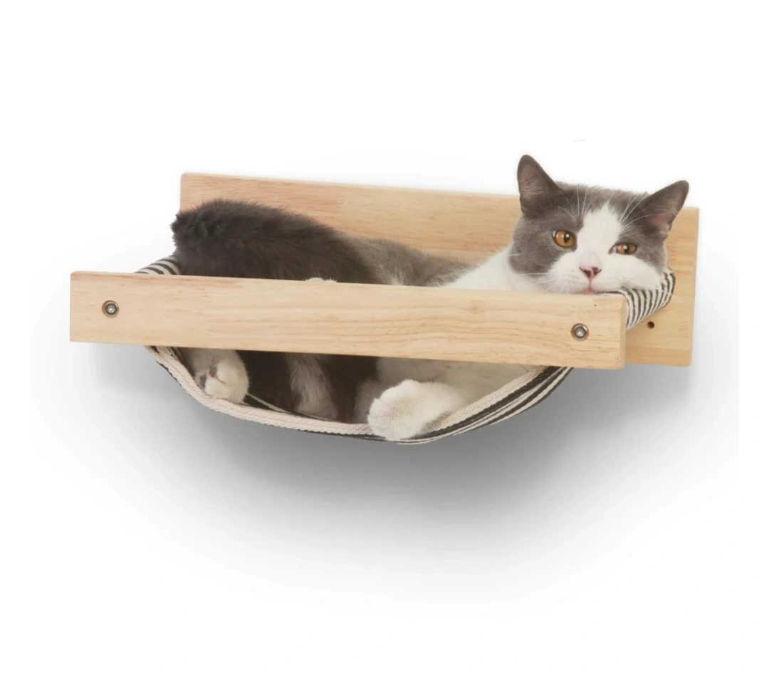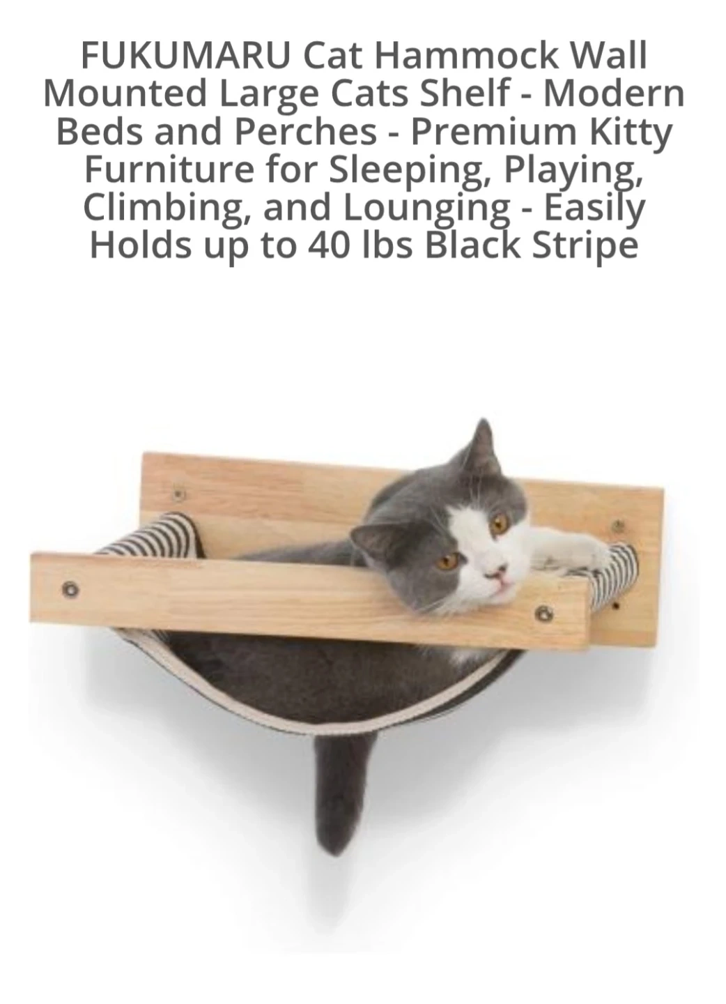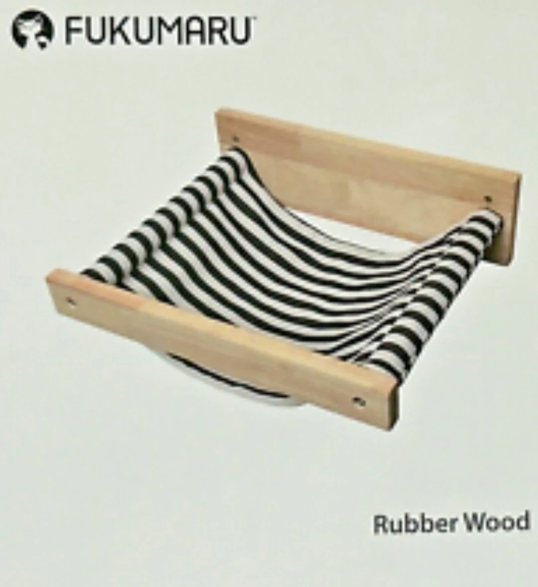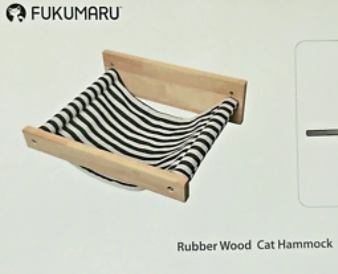 112This FUKUMARU cat hammock is perfect for your furry friend! It's made of solid rubber wood and breathable canvas, ensuring comfort and durability. The hammock features a stylish black and white stripe design. Dimensions are 15.7 inches by 13.8 inches, and it can easily hold up to 40 lbs. Includes all the necessary hardware for easy wall mounting Brand new!