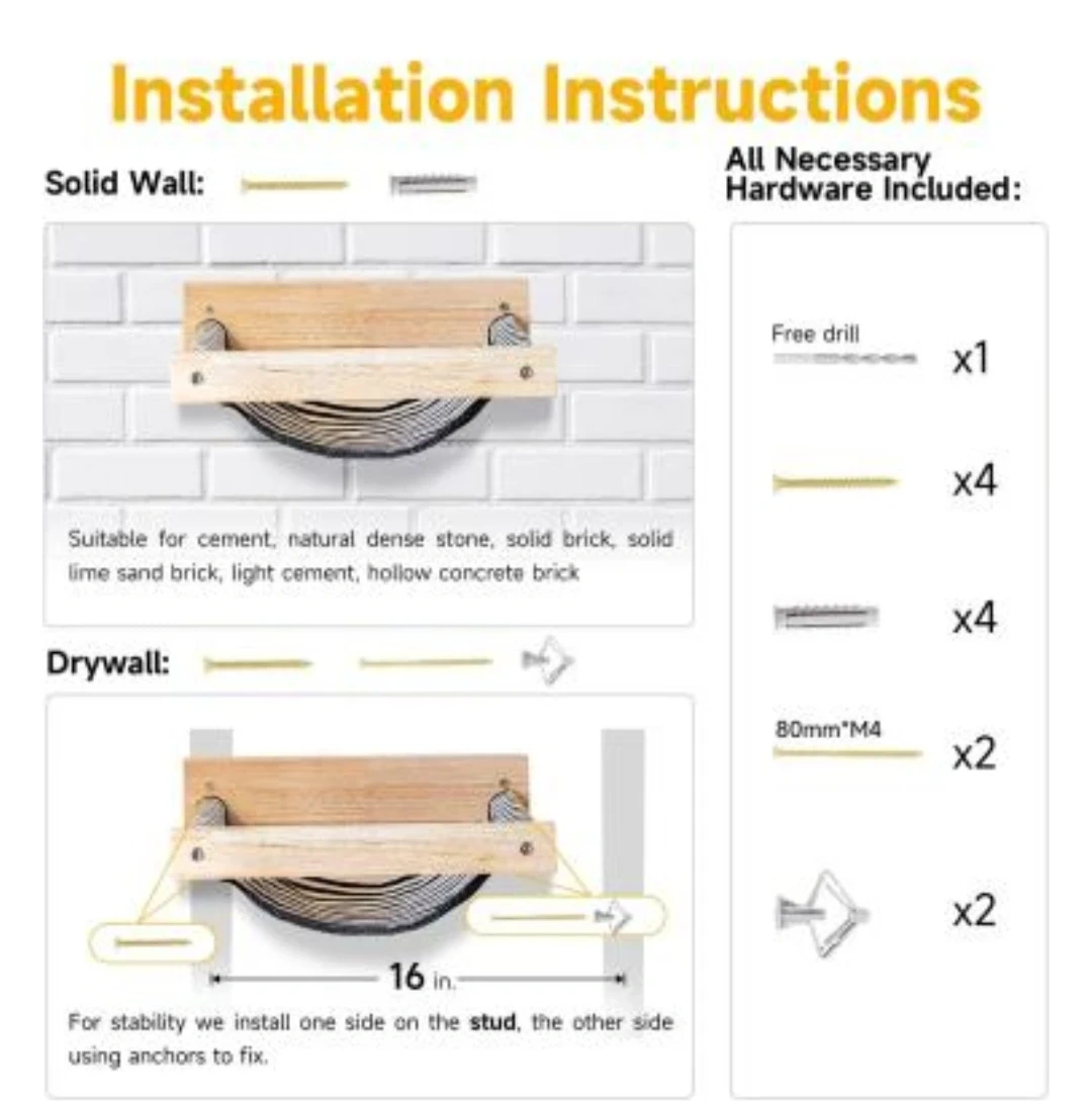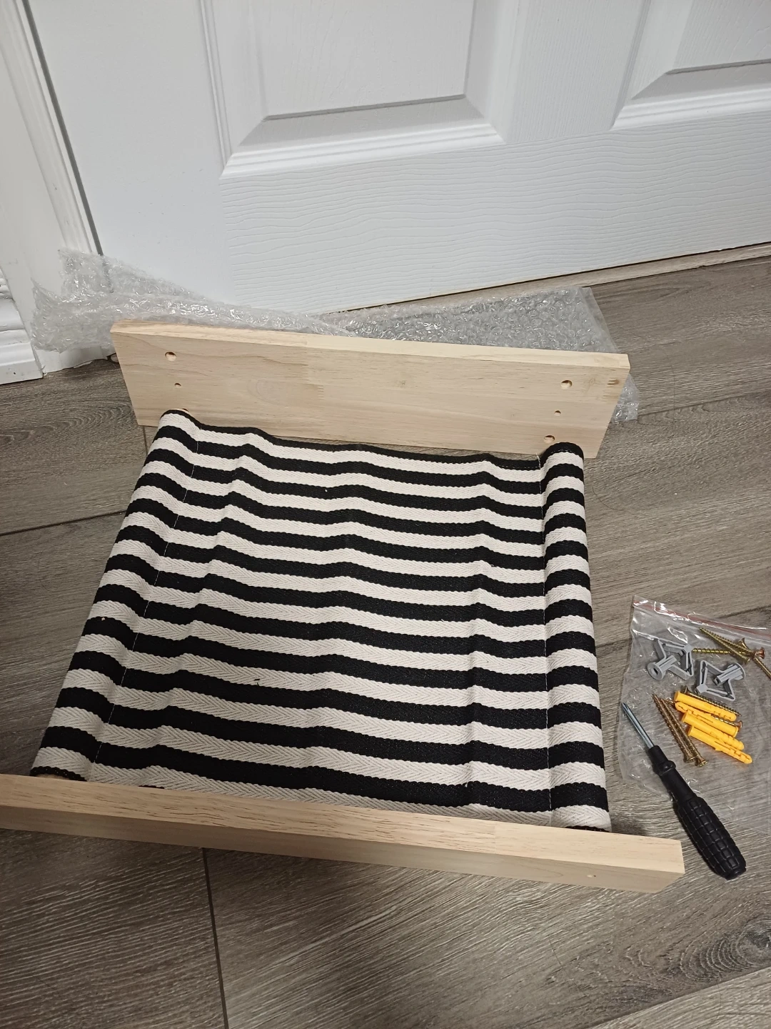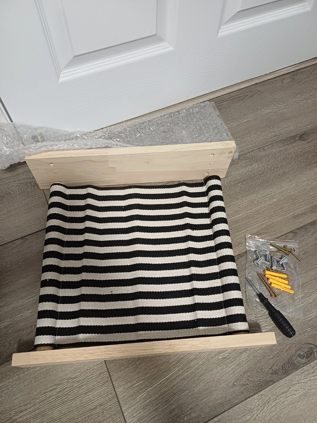 112This FUKUMARU cat hammock is perfect for your furry friend! It's made of solid rubber wood and breathable canvas, ensuring comfort and durability. The hammock features a stylish black and white stripe design. Dimensions are 15.7 inches by 13.8 inches, and it can easily hold up to 40 lbs. Includes all the necessary hardware for easy wall mounting Brand new!