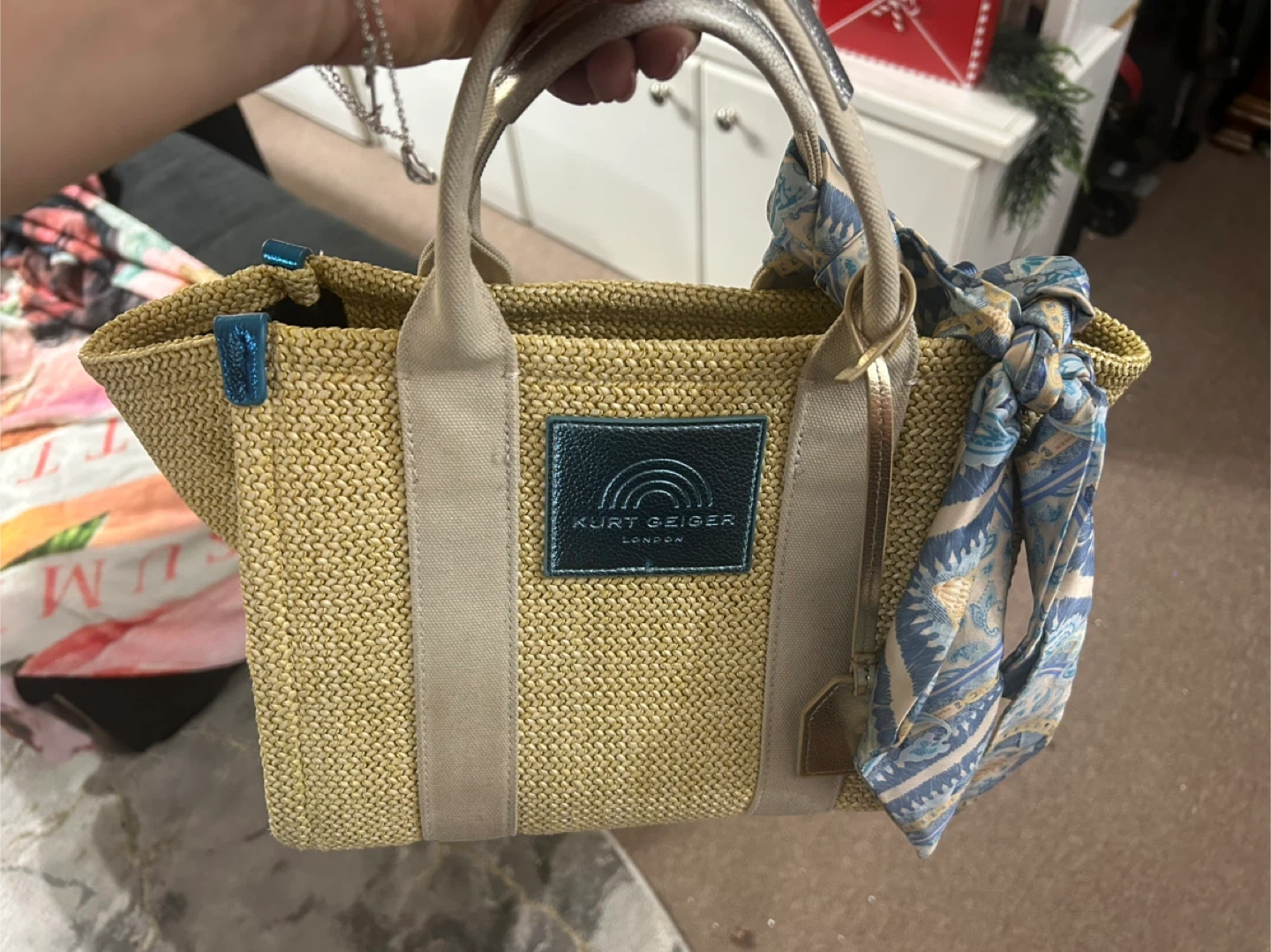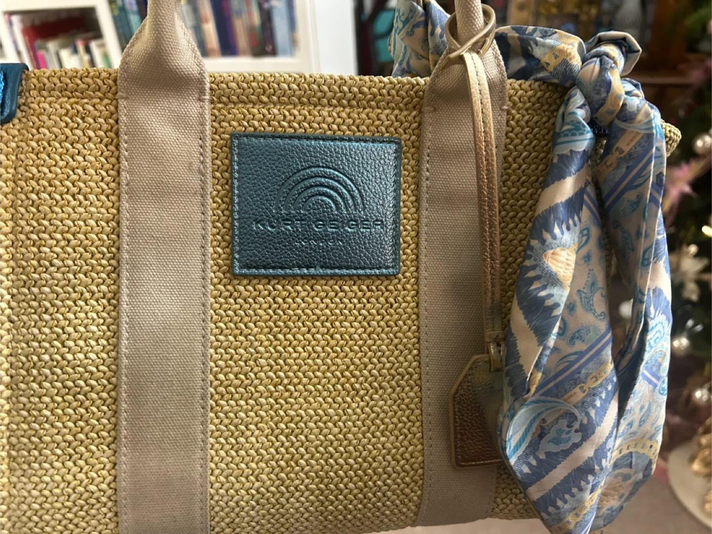 This is a Kurt Geiger London Mini Raffia Kensington tote bag. It's in great condition and features a unique raffia texture. The bag has a blue leather logo patch and comes with a stylish blue patterned scarf tied to the handle. Perfect for adding a touch of elegance to any outfit!