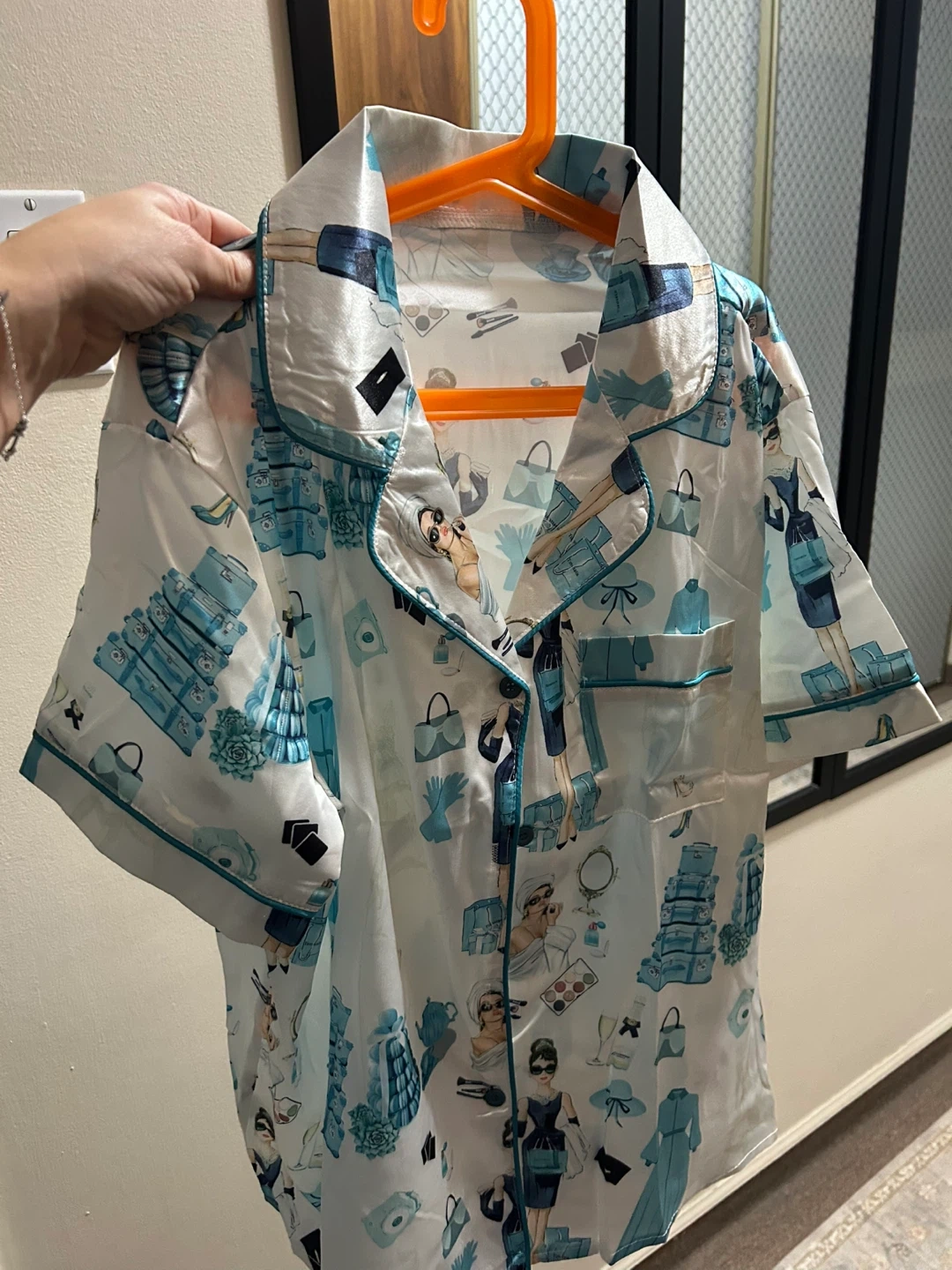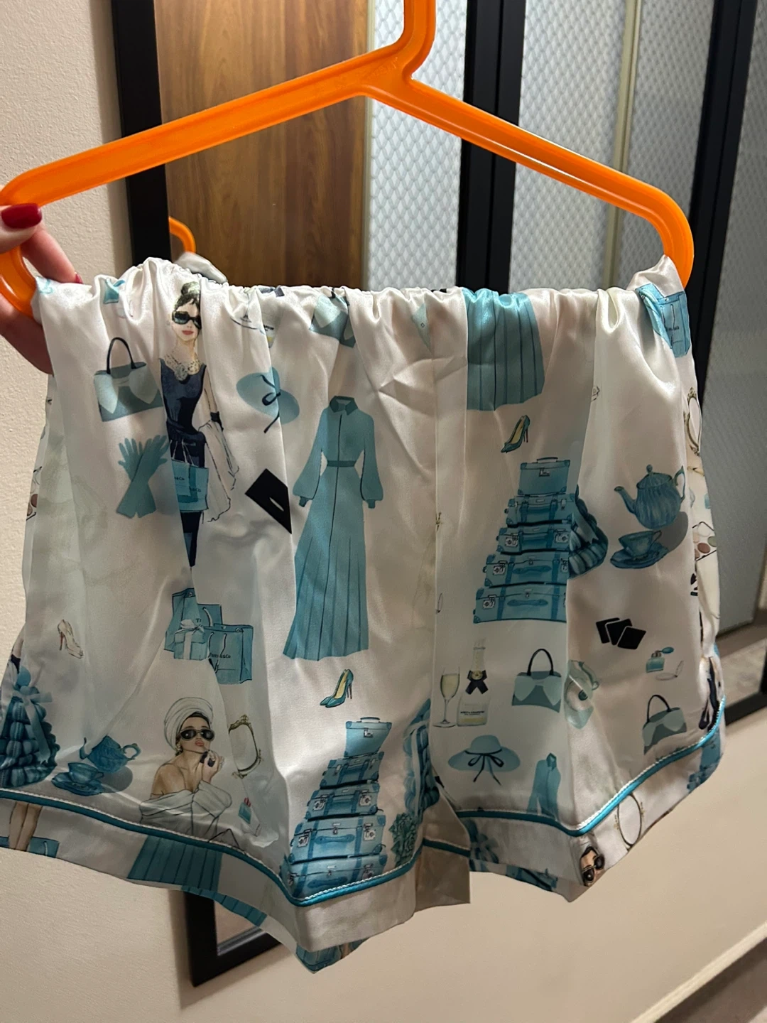 Super cute women's pajama set featuring a fun print with ladies, handbags, hats and more in shades of blue on a white background! It's in great condition and perfect for lounging around the house.