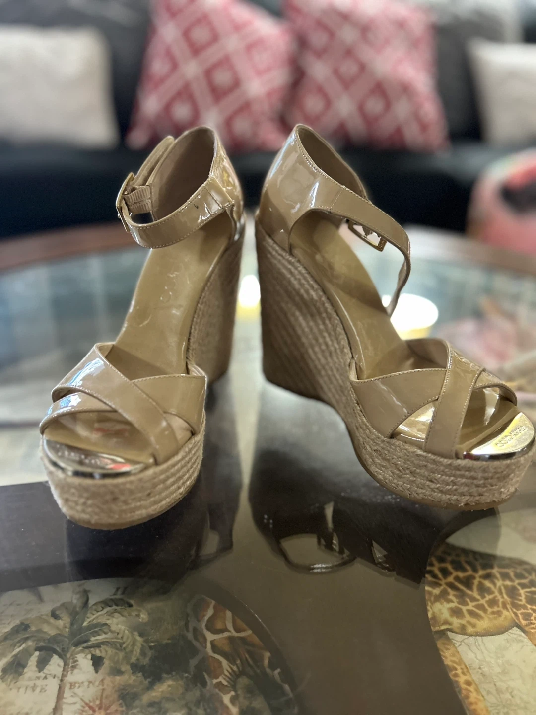 Selling a pair of Jimmy Choo espadrille wedge sandals. They're a beautiful neutral colour and feature a wedge heel. Perfect for summer!