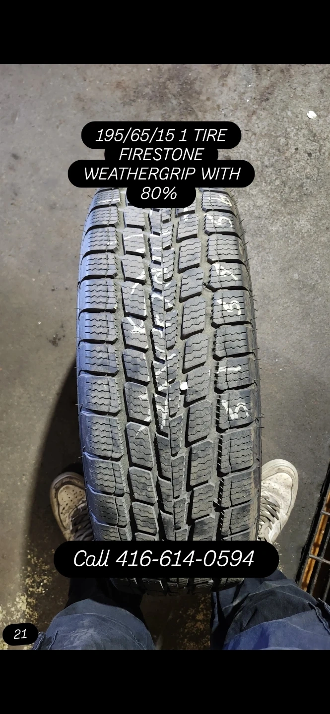 27Selling a single Firestone WeatherGrip tire, size 195/65/15. It's got about 80% of the tread left, so it's still in great shape for winter or all-season driving!