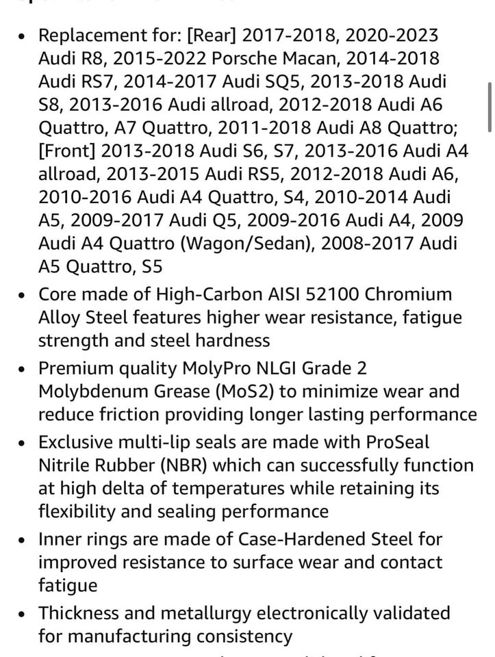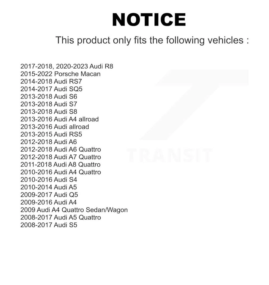 Replacement for: [Rear] 2017-2018, 2020-2023 Audi R8, 2015-2022 Porsche Macan, 2014-2018 Audi RS7, 2014-2017 Audi SQ5, 2013-2018 Audi 58, 2013-2016 Audi allroad, 2012-2018 Audi A6 Quattro, A7 Quattro, 2011-2018 Audi A8 Quattro;