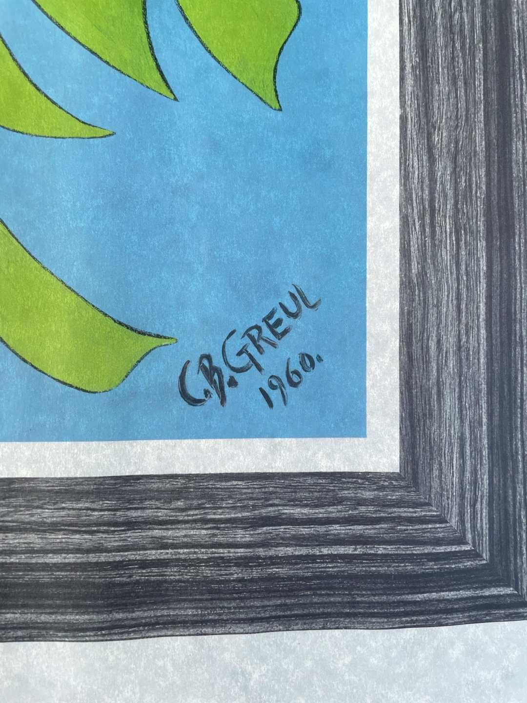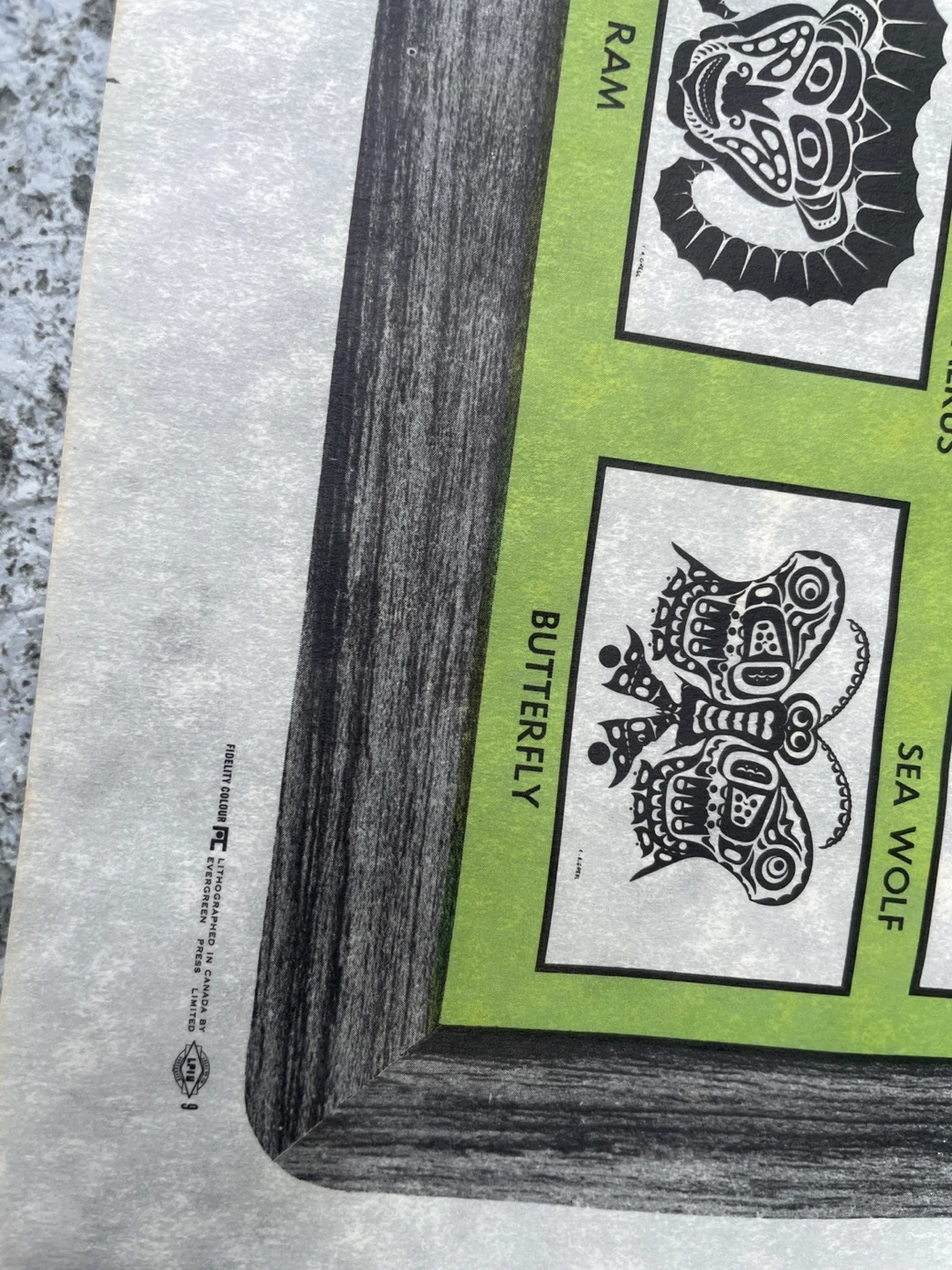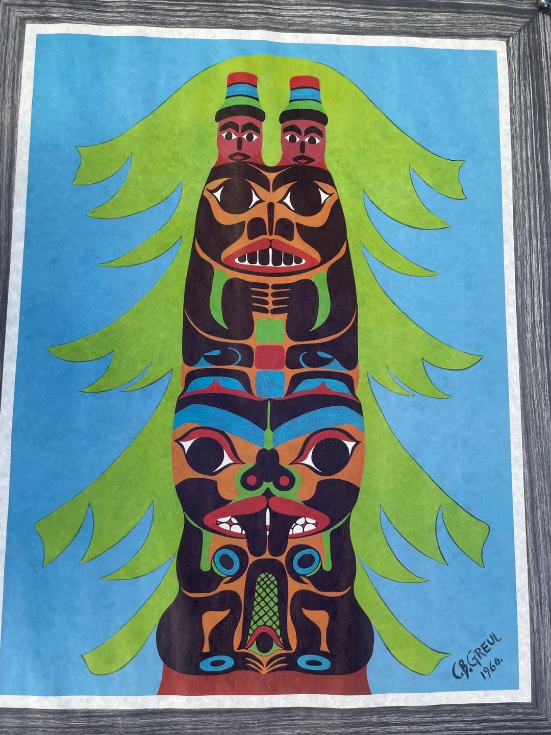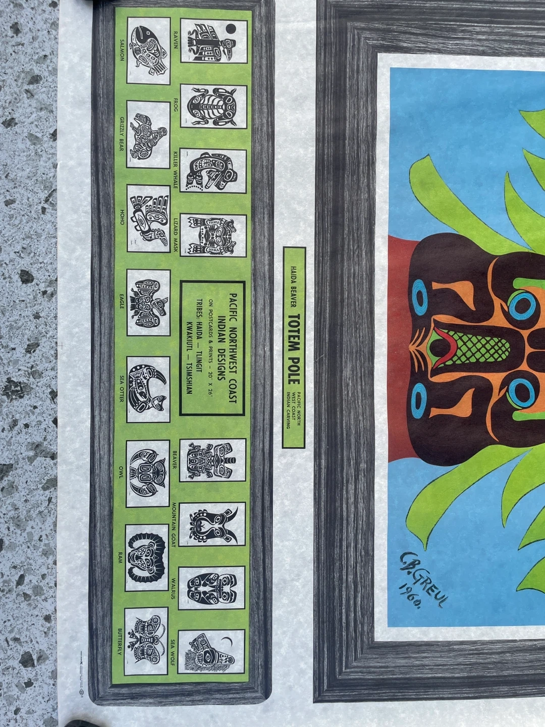 Selling a framed print of a Pacific Northwest Coast Indian Design Totem Pole, signed C.B. Greul, 1960. It features various Haida Beaver Totem Pole designs.