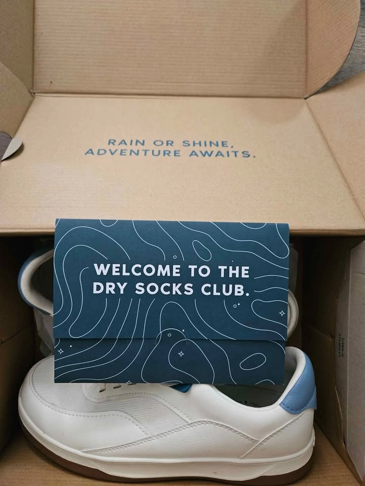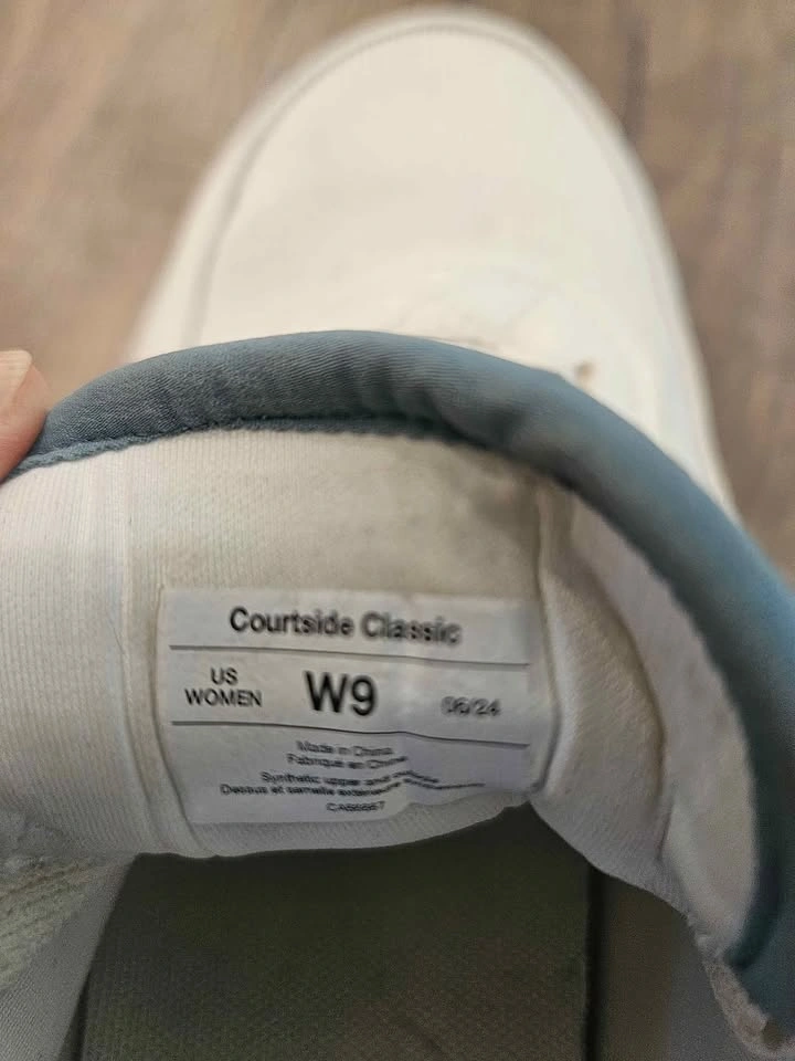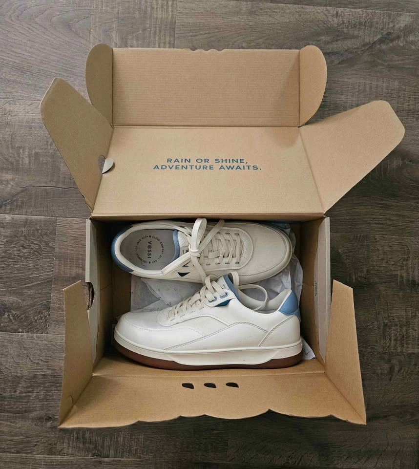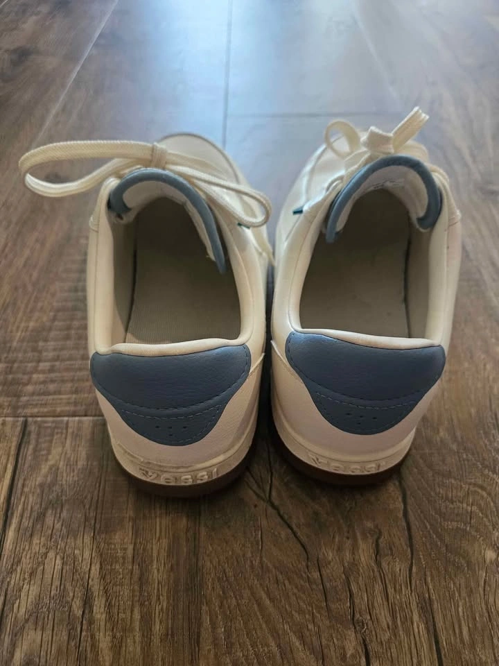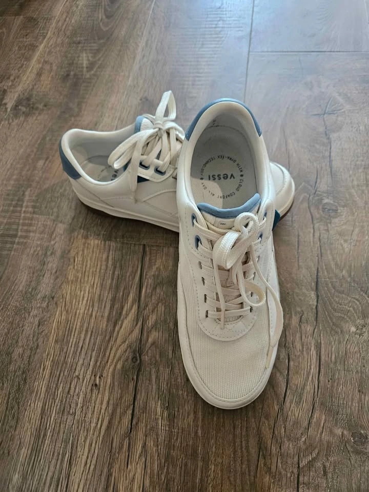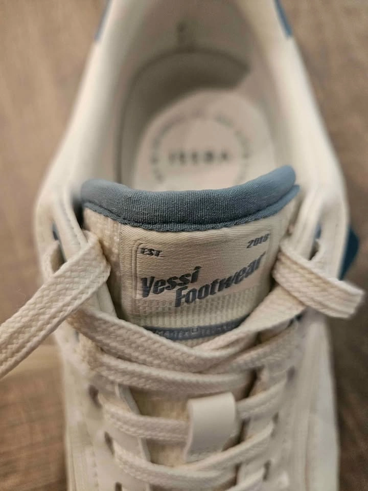 Vessi stylish off-white vintage look sneakers with blue accents. Like new! Only worn a couple of times indoors. Perfect for casual wear or comfy walks (especially in the rain!). Smoke-free home. Comes in original box