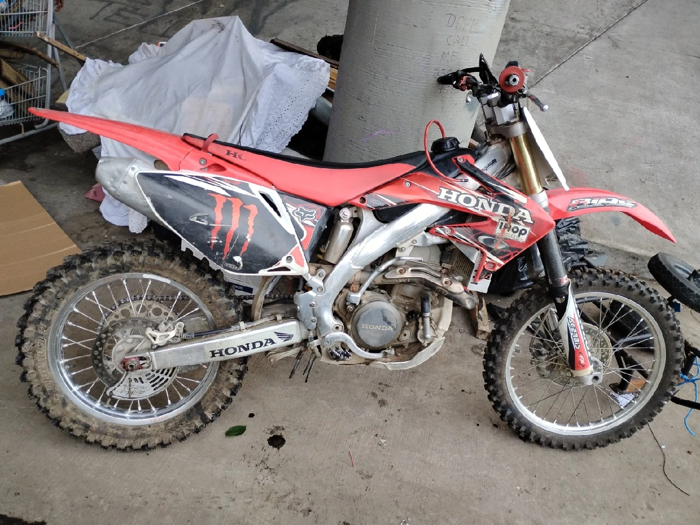 Buy & SellHonda CRF450R Dirt BikeHonda CRF450R Dirt Bike$900Selling a Honda CRF450R dirt bike. It's red and black with Monster Energy graphics. The tires are a bit muddy from use.ConditionGoodWHERE TO MEETCheck LocationView MapSELLERmikeInlet Centre100 reviews8 chats·3 favorites·84 views