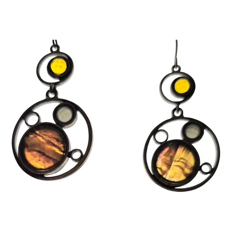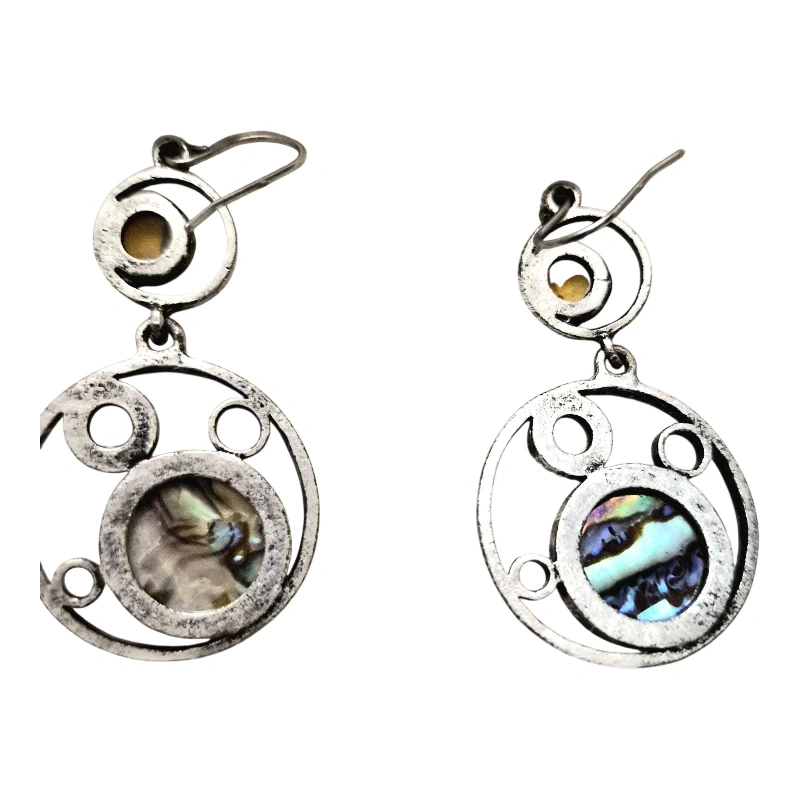 Handcrafted earrings featuring iridescent abalone shell, paired with complementary accent stones in warm and neutral tones. Each piece is uniquely layered for visual depth and natural charm.