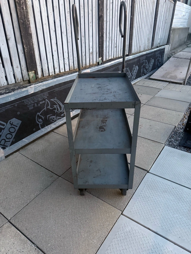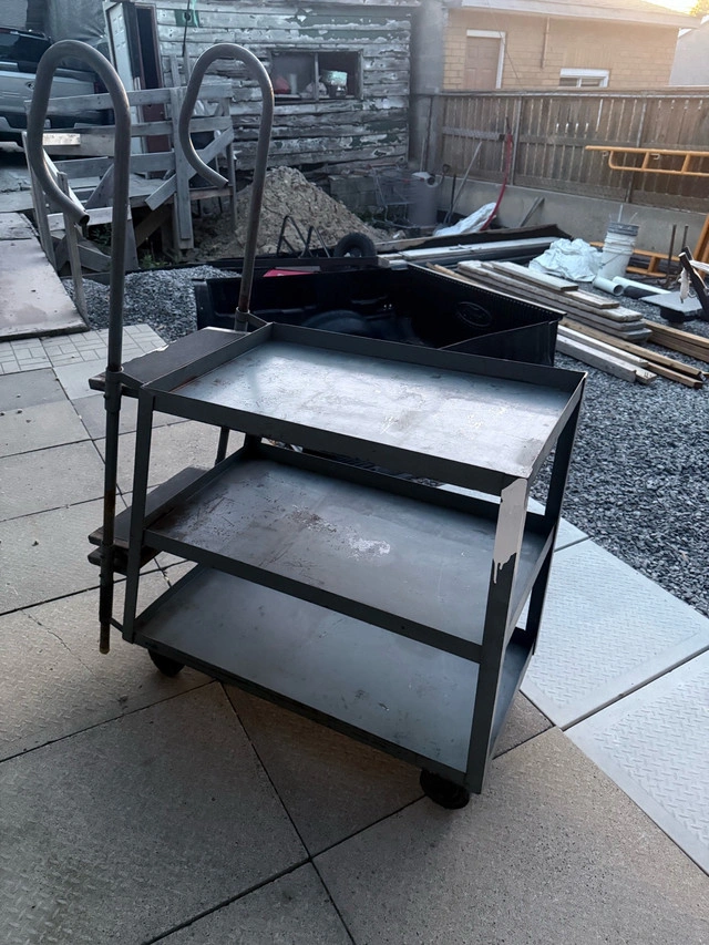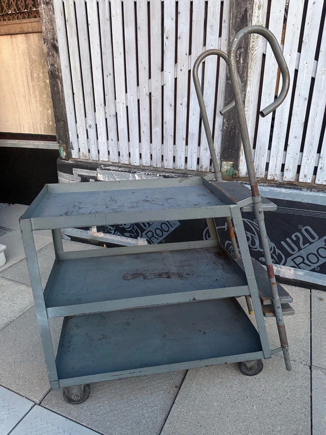 20This is a sturdy, Metal cart with a ladder, perfect for a garage or workshop needing mobile storage. It has three shelves and a handle to make moving it around a breeze. * Three shelves for ample storage. * Sturdy metal construction. * Easy-to-grip handle for mobility. * Mounted on casters. This cart is still available if you're seeing the ad!